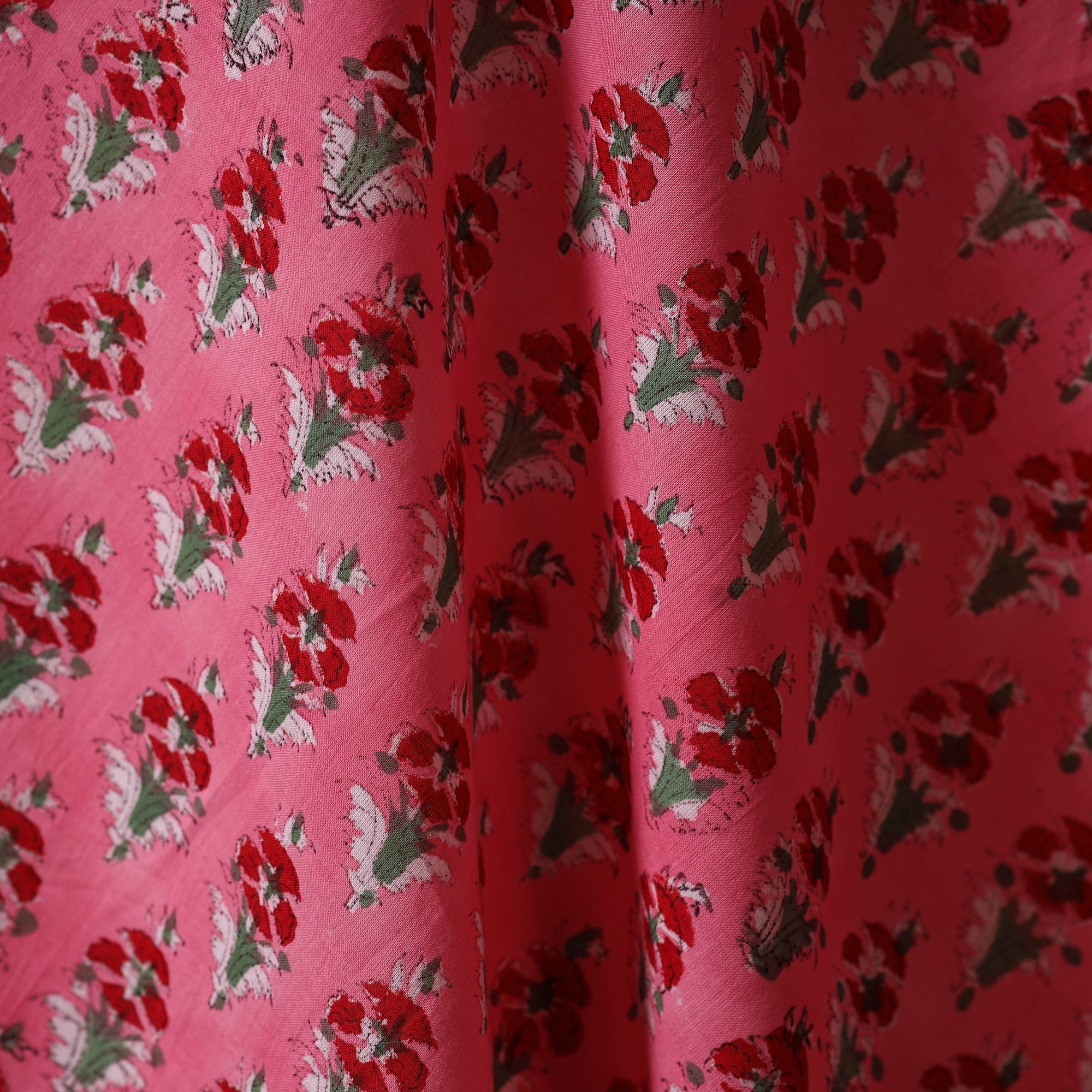 Pink sanganeri hand block printed cotton fabric by artisans in Sanganer, Jaipur, it showcases delicate floral patterns created with traditional wooden blocks. The breathable lightweight pure cotton is ideal for making kurtas, dresses, tunics or even home decor items like cushions and curtains.