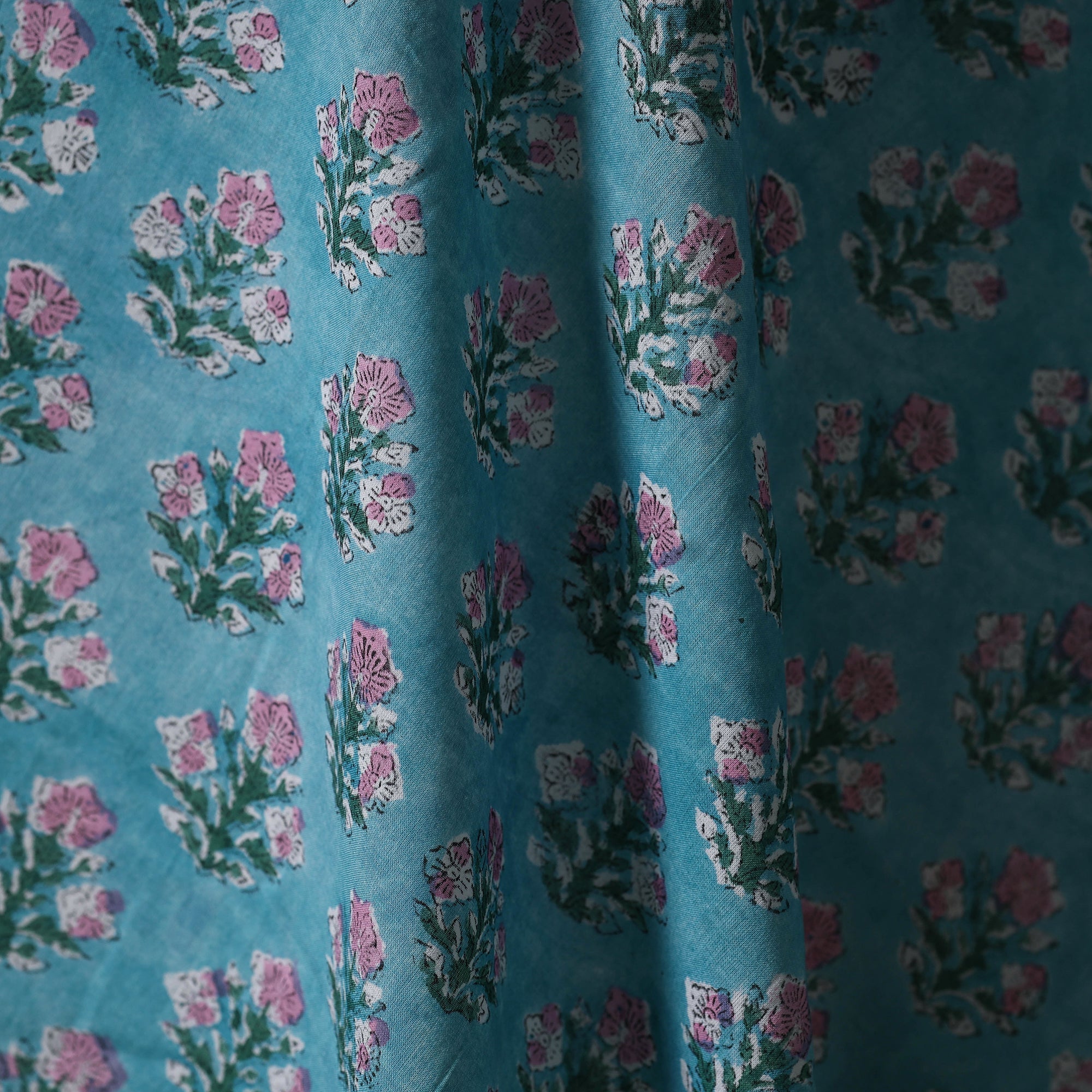 Blue sanganeri hand block printed cotton fabric by artisans in Sanganer, Jaipur, it showcases delicate floral patterns created with traditional wooden blocks. The breathable lightweight pure cotton is ideal for making kurtas, dresses, tunics or even home decor items like cushions and curtains.