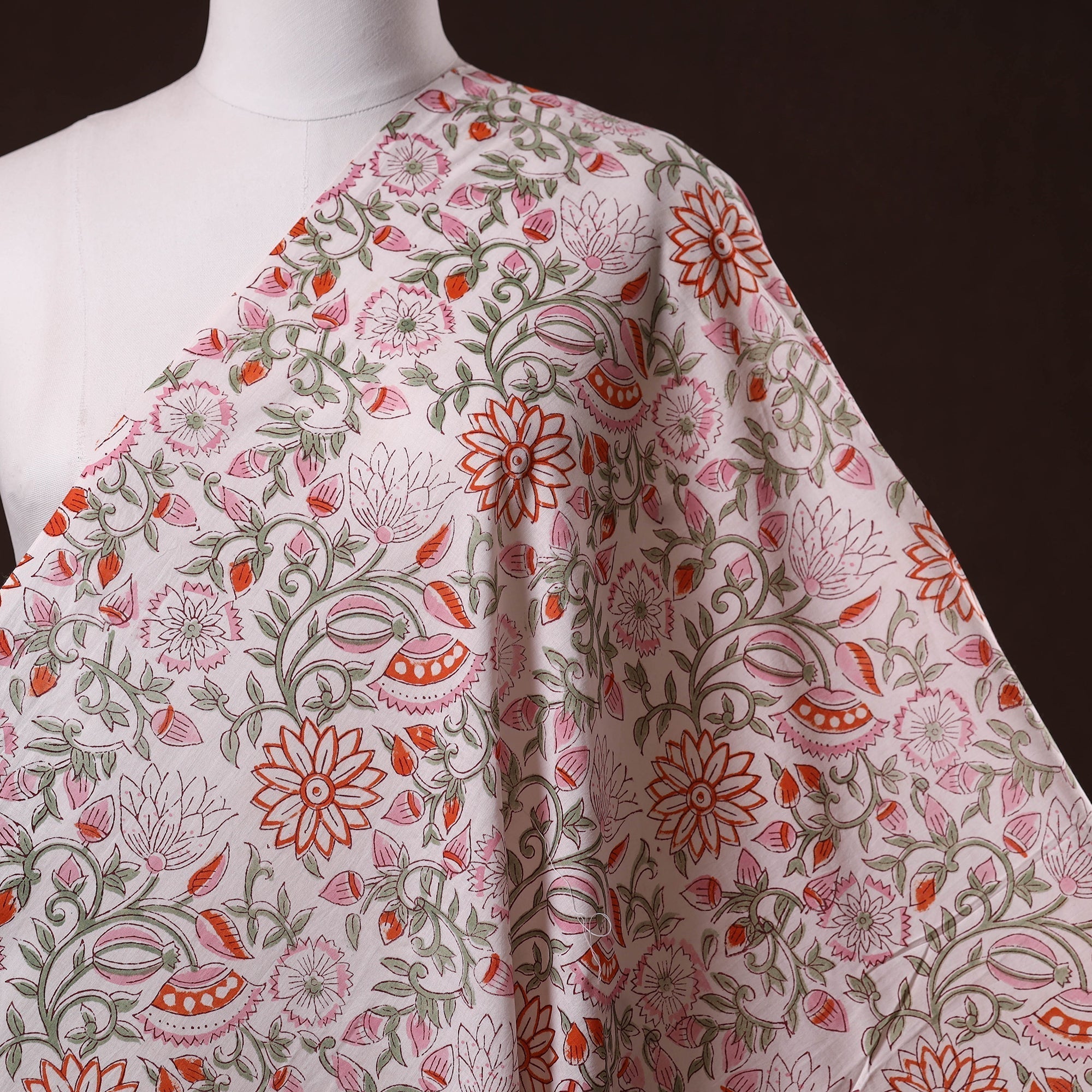 Pink sanganeri hand block printed cotton fabric by artisans in Sanganer, Jaipur, it showcases delicate floral patterns created with traditional wooden blocks. The breathable lightweight pure cotton is ideal for making kurtas, dresses, tunics or even home decor items like cushions and curtains.