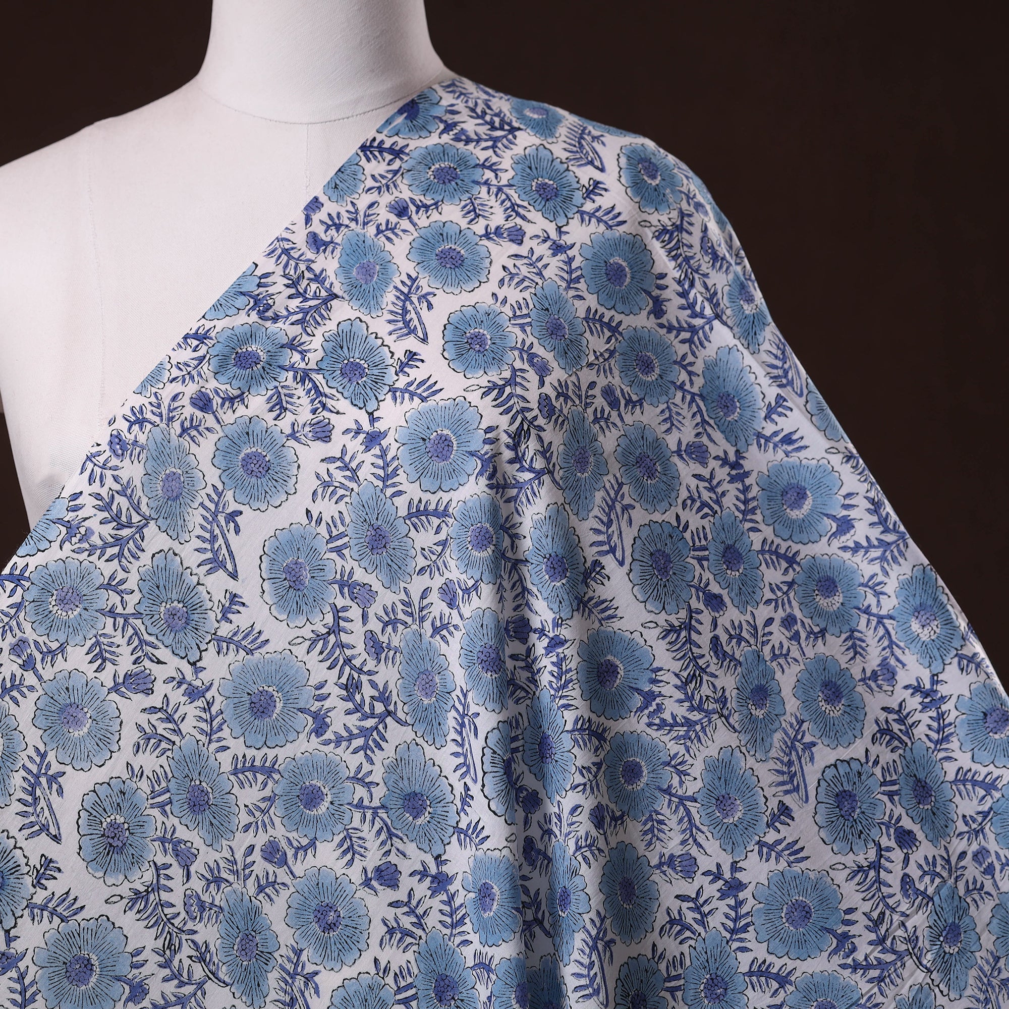 Blue sanganeri hand block printed cotton fabric by artisans in Sanganer, Jaipur, it showcases delicate floral patterns created with traditional wooden blocks. The breathable lightweight pure cotton is ideal for making kurtas, dresses, tunics or even home decor items like cushions and curtains.