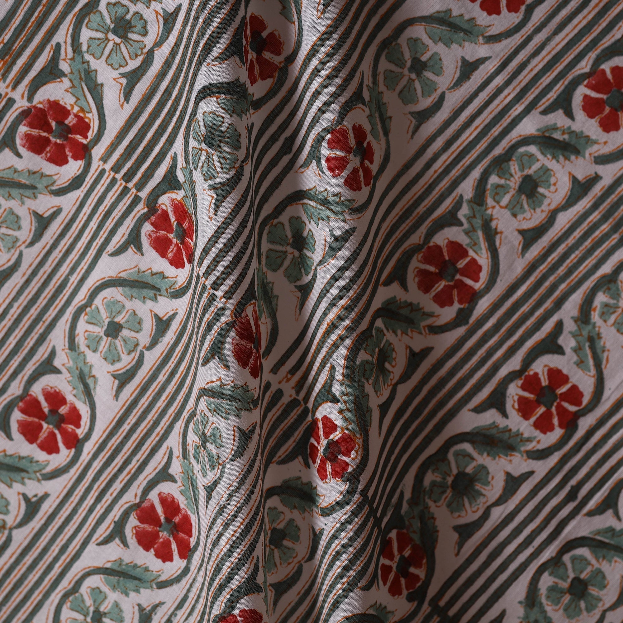 White sanganeri hand block printed cotton fabric by artisans in Sanganer, Jaipur, it showcases delicate floral patterns created with traditional wooden blocks. The breathable lightweight pure cotton is ideal for making kurtas, dresses, tunics or even home decor items like cushions and curtains.