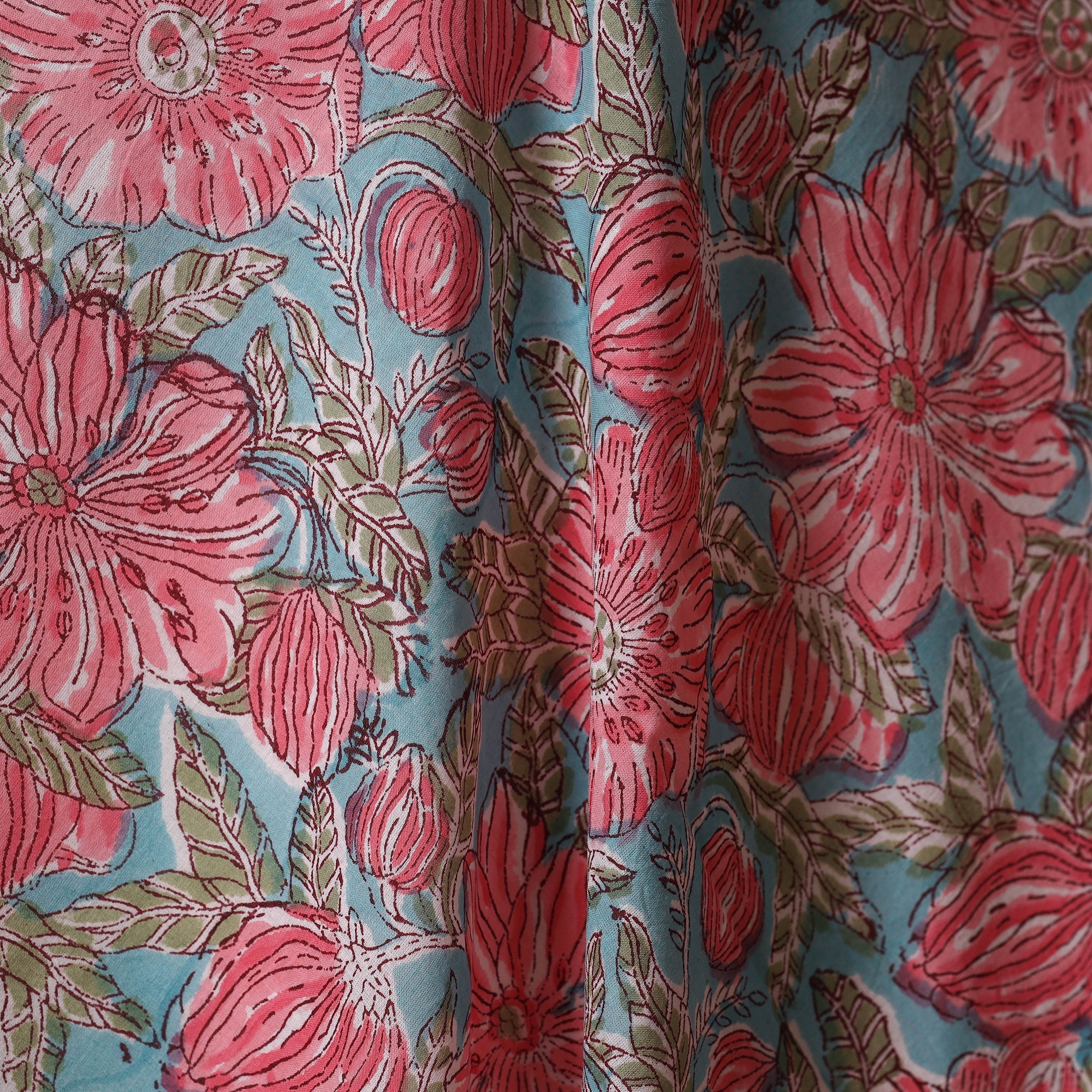 Sanganeri hand block printed cotton fabric by artisans in Sanganer, Jaipur, it showcases delicate floral patterns created with traditional wooden blocks. The breathable lightweight pure cotton is ideal for making kurtas, dresses, tunics or even home decor items like cushions and curtains.