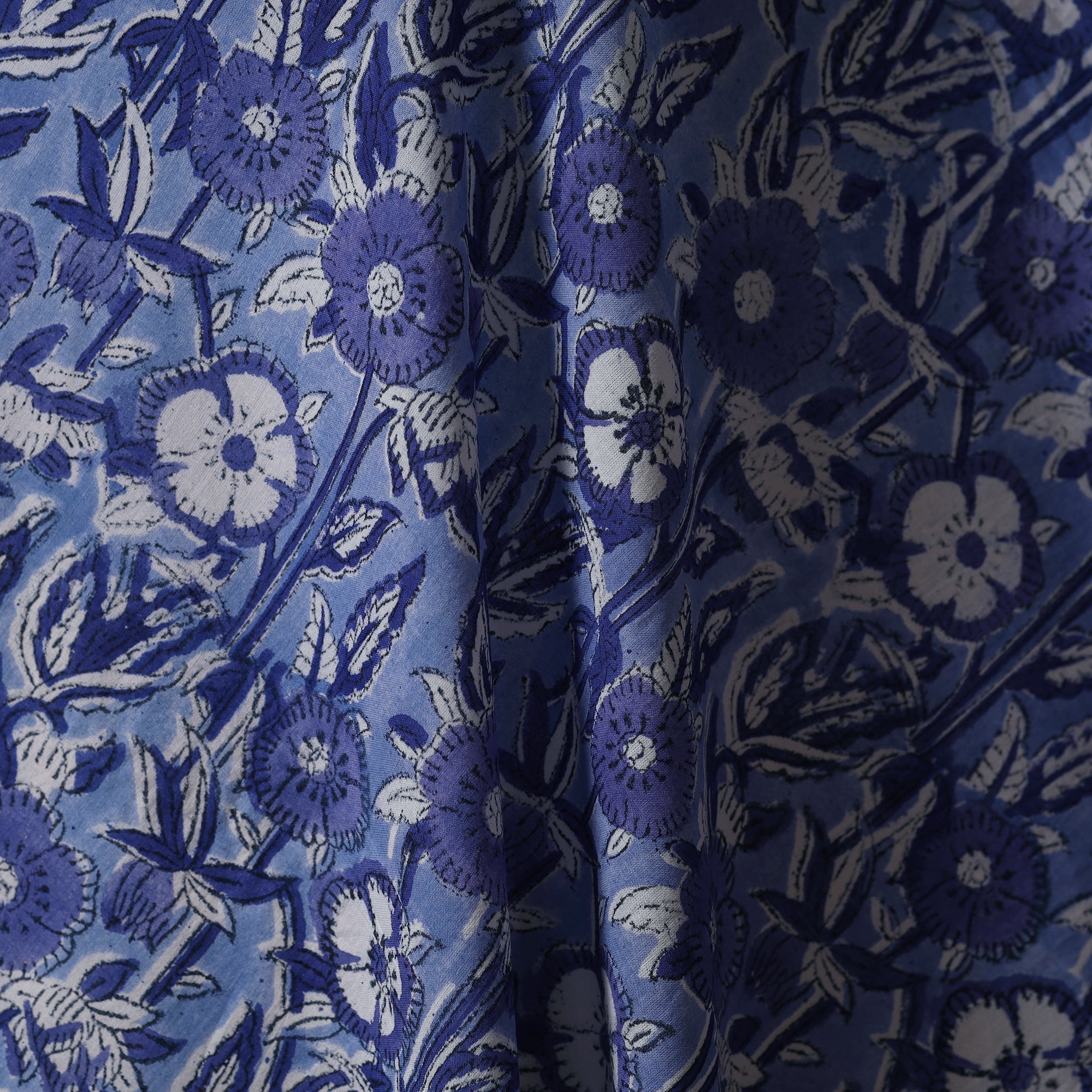 Blue sanganeri hand block printed cotton fabric by artisans in Sanganer, Jaipur, it showcases delicate floral patterns created with traditional wooden blocks. The breathable lightweight pure cotton is ideal for making kurtas, dresses, tunics or even home decor items like cushions and curtains.