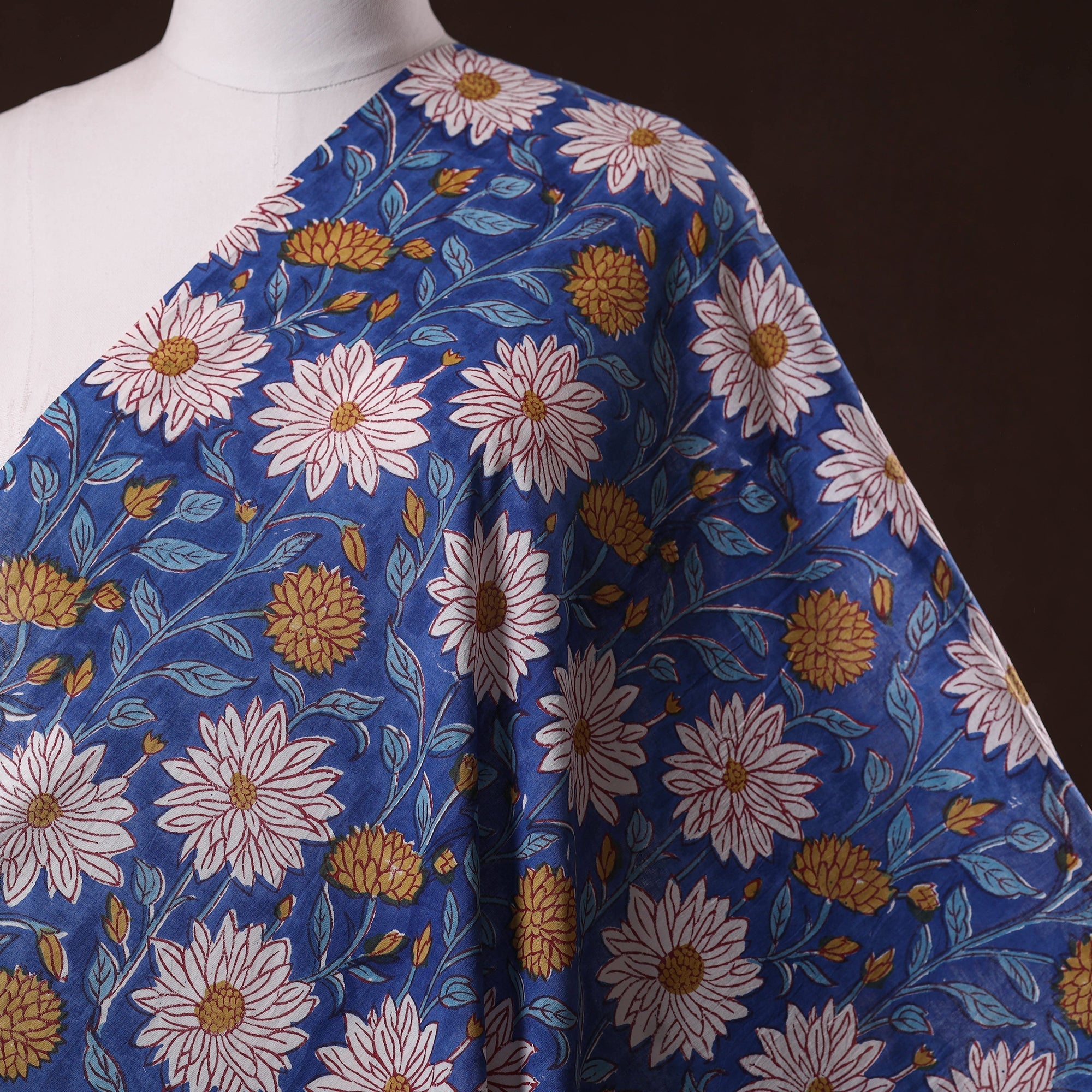 Blue sanganeri hand block printed cotton fabric by artisans in Sanganer, Jaipur, it showcases delicate floral patterns created with traditional wooden blocks. The breathable lightweight pure cotton is ideal for making kurtas, dresses, tunics or even home decor items like cushions and curtains.