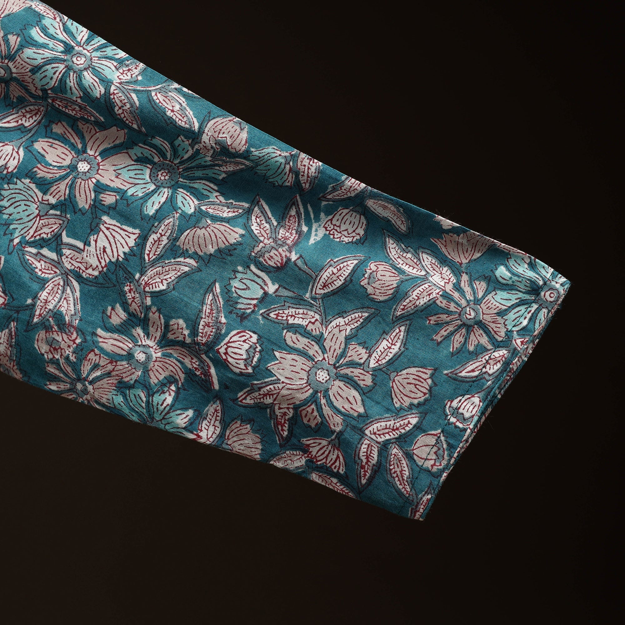 Blue sanganeri hand block print pure cotton readymade blouse, designed with full sleeves, it offers a comfortable fit while adding a graceful touch to your saree look. The back comes with a hook closure along with a dori tie-up, ensuring a secure and adjustable fit. It pairs beautifully with both everyday and every occasion sarees.