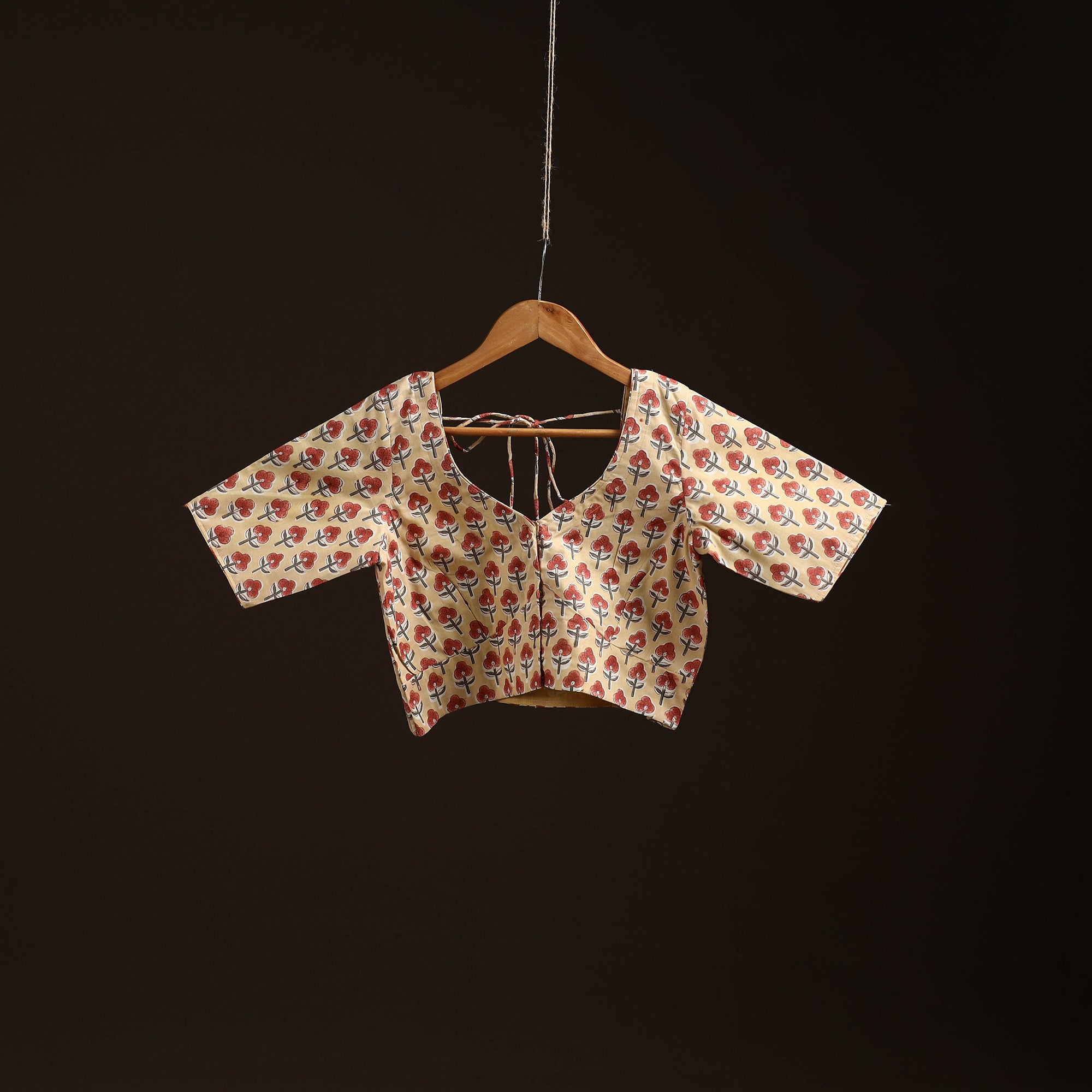 Beige sanganeri hand block print pure cotton readymade blouse, designed with half sleeves, it offers a comfortable fit and a graceful finish. The blouse comes with a front hook closure and a dori tie-up at the back, pairing beautifully with both everyday and every occasion sarees.