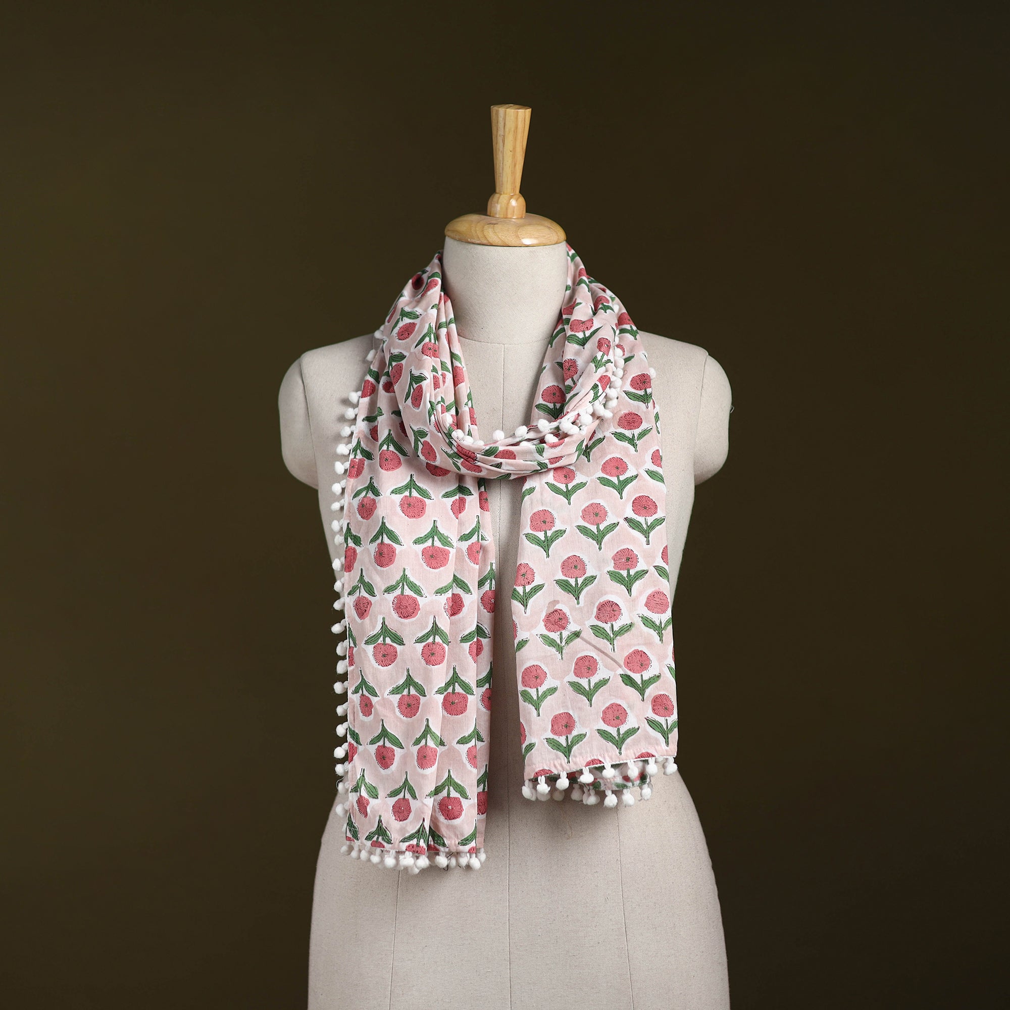 Sanganeri stole is beautifully hand block printed using traditional techniques by skilled artisans from Sanganer, Rajasthan. Made from breathable cotton, it features floral motifs and pom-poms, adding grace to both everyday and festive wear.