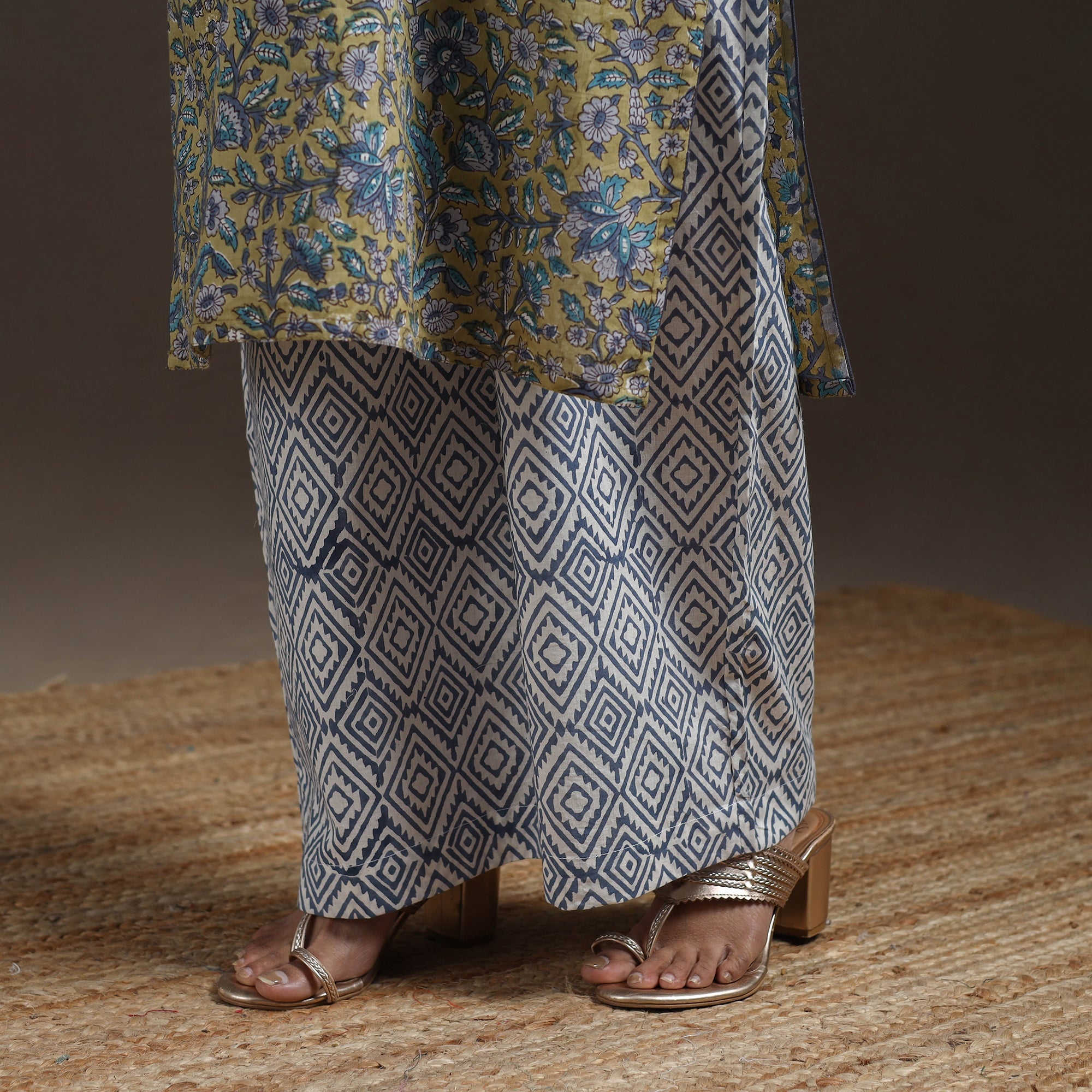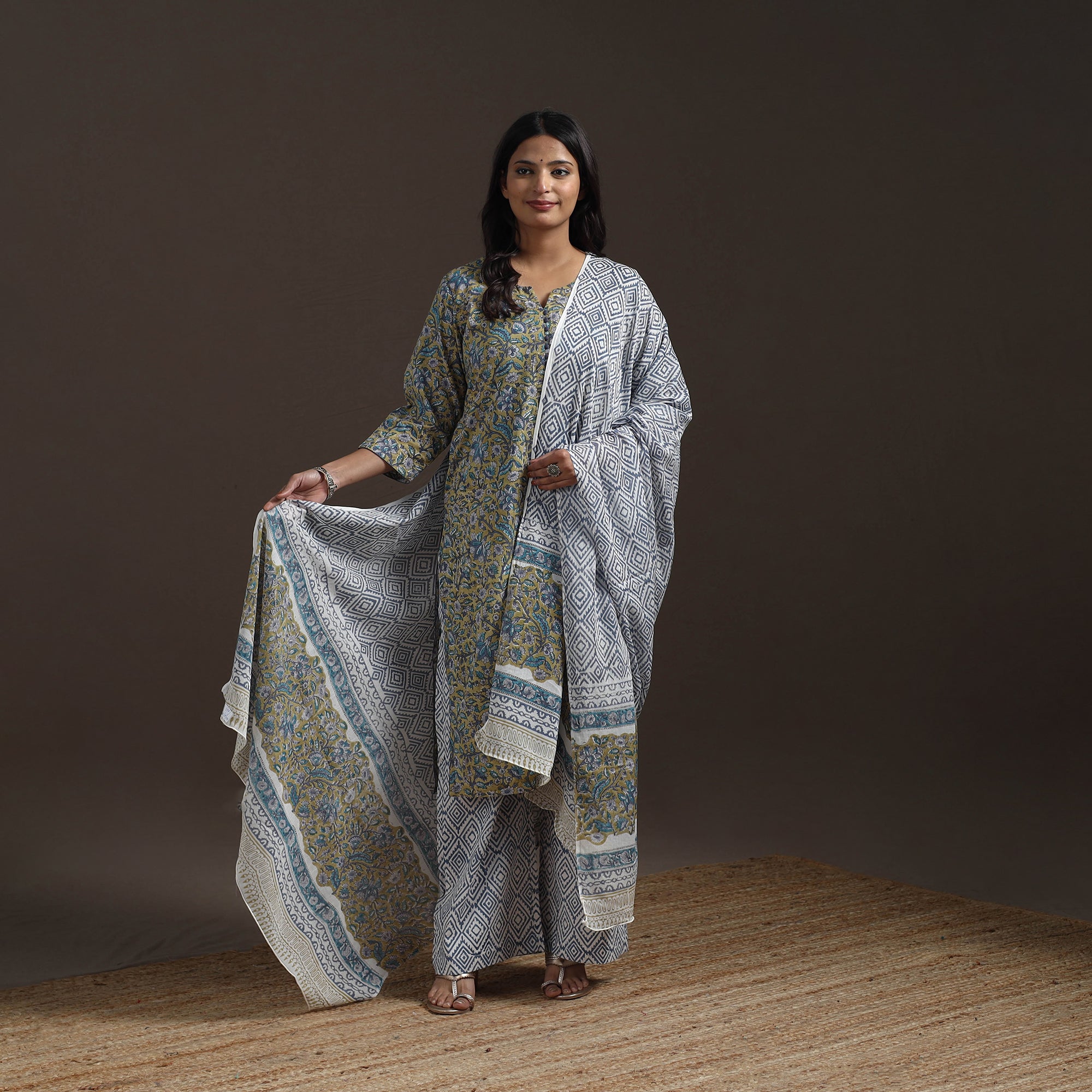 Pure cotton suit set features traditional sanganeri block printing from Rajasthan known for its fine floral patterns. Made using hand carved wooden blocks. Includes straight kurta with side pocket palazzo with elastic waist and pockets and matching mul cotton dupatta. Perfect for both daily wear and special moments, it beautifully combines comfort and charm.