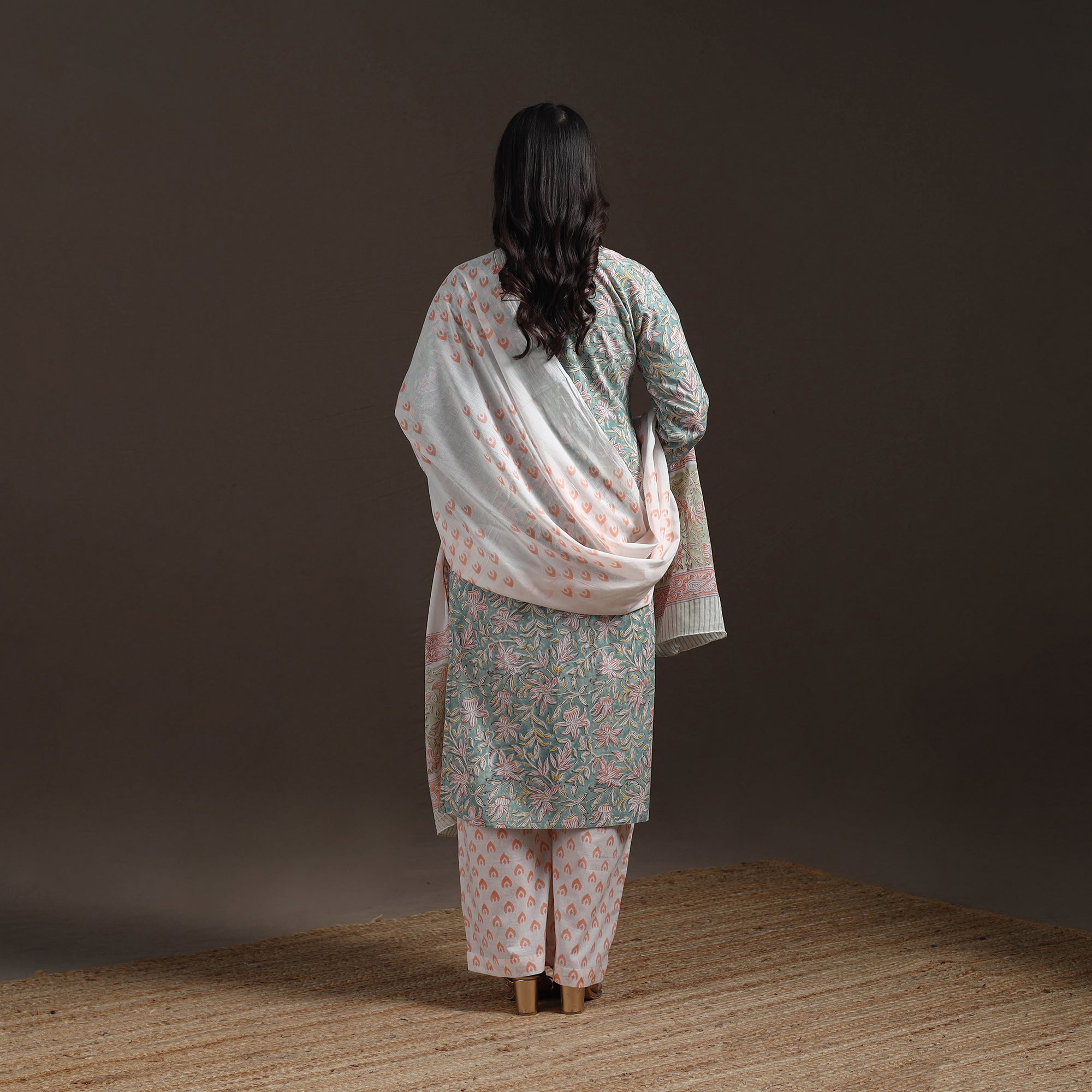 Pure cotton suit set features traditional sanganeri block printing from Rajasthan known for its fine floral patterns. Made using hand carved wooden blocks. Includes straight kurta with side pocket palazzo with elastic waist and pockets and matching mul cotton dupatta. Perfect for both daily wear and special moments, it beautifully combines comfort and charm.