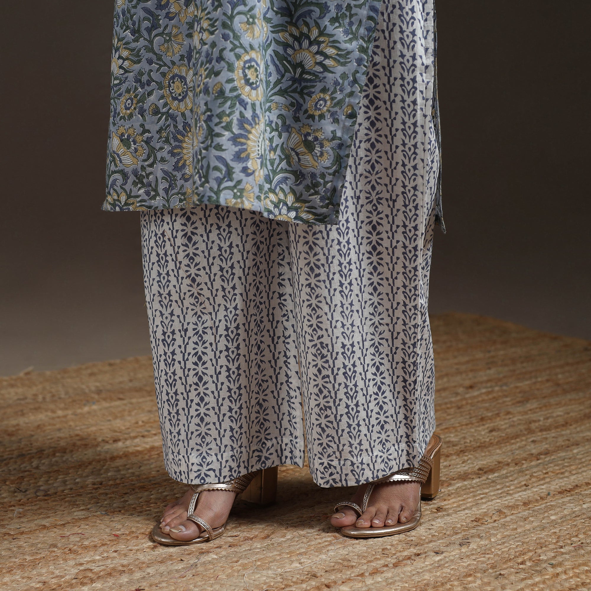 Pure cotton suit set features traditional sanganeri block printing from Rajasthan known for its fine floral patterns. Made using hand carved wooden blocks. Includes straight kurta with side pocket palazzo with elastic waist and pockets and matching mul cotton dupatta. Perfect for both daily wear and special moments, it beautifully combines comfort and charm.