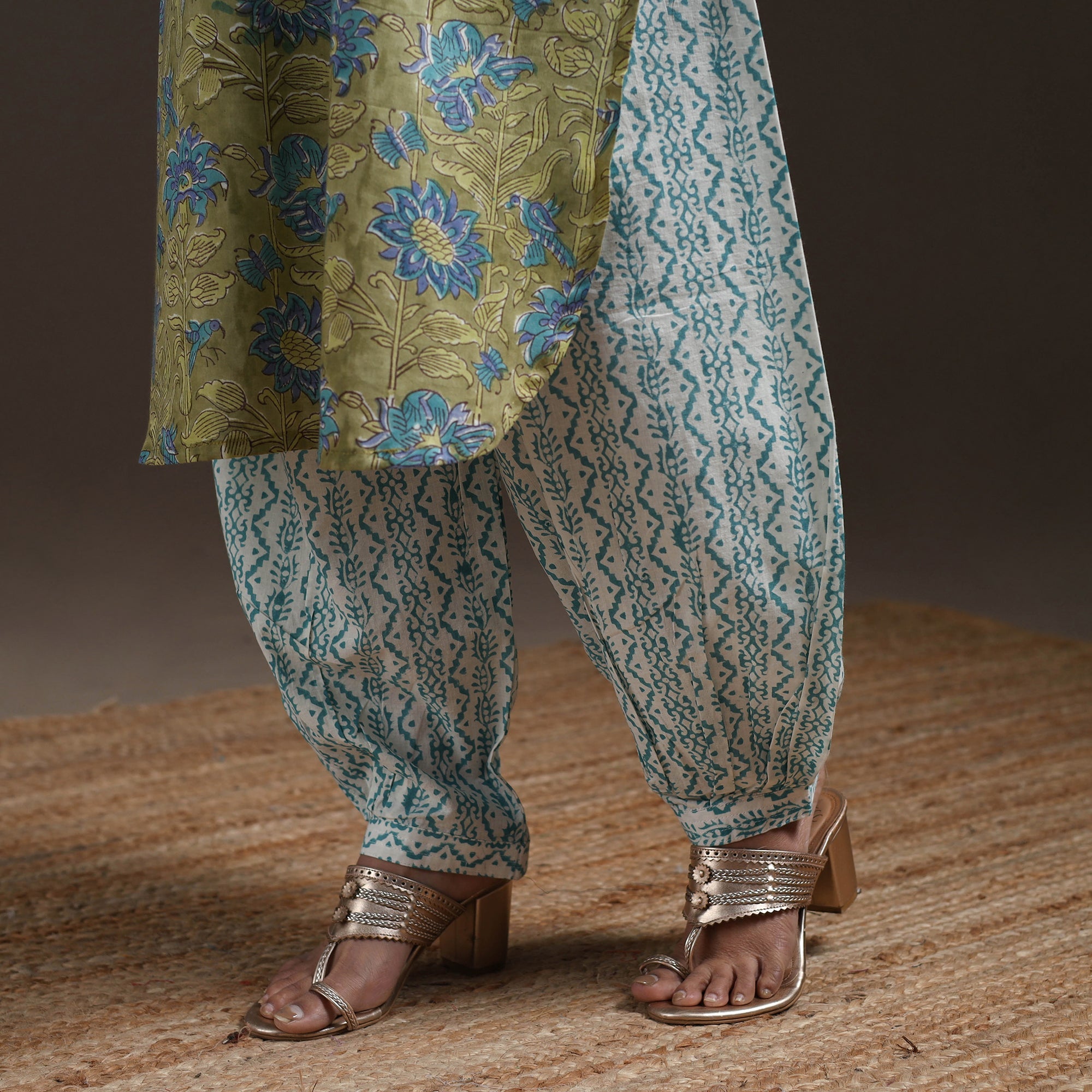 Pure cotton suit set features traditional sanganeri block printing from Rajasthan known for its fine floral patterns. Made using hand carved wooden blocks. Includes straight kurta with side pocket afghani salwar with elastic waist and drawstring. Perfect for both daily wear and special moments, it beautifully combines comfort and charm.