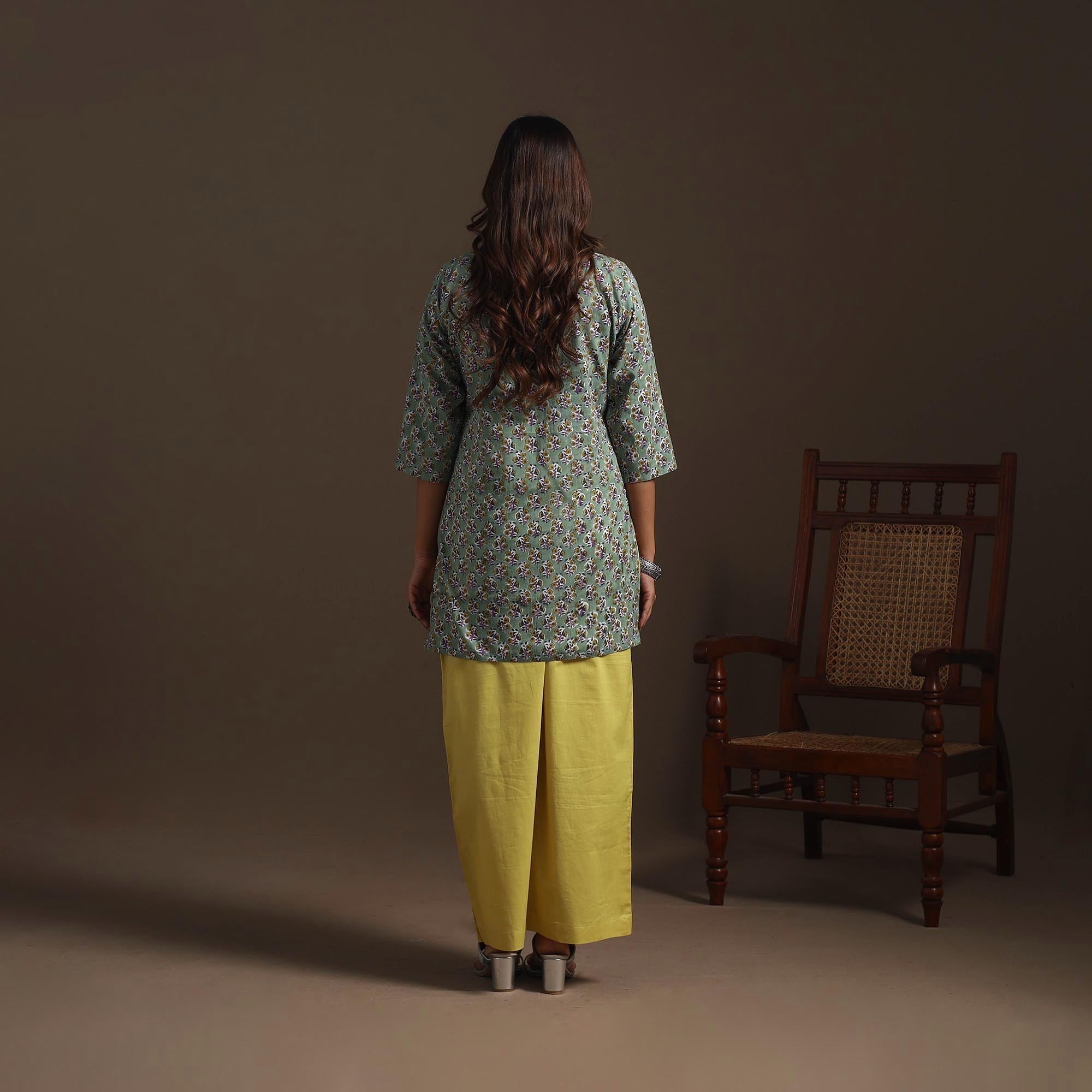 Green hand block print short sanganeri kurta for women. Crafted from soft cotton, it features delicate floral motifs inspired by the traditional craft of Sanganer, Rajasthan. Designed for a relaxed fit it’s ideal for both casual outings or workdays.