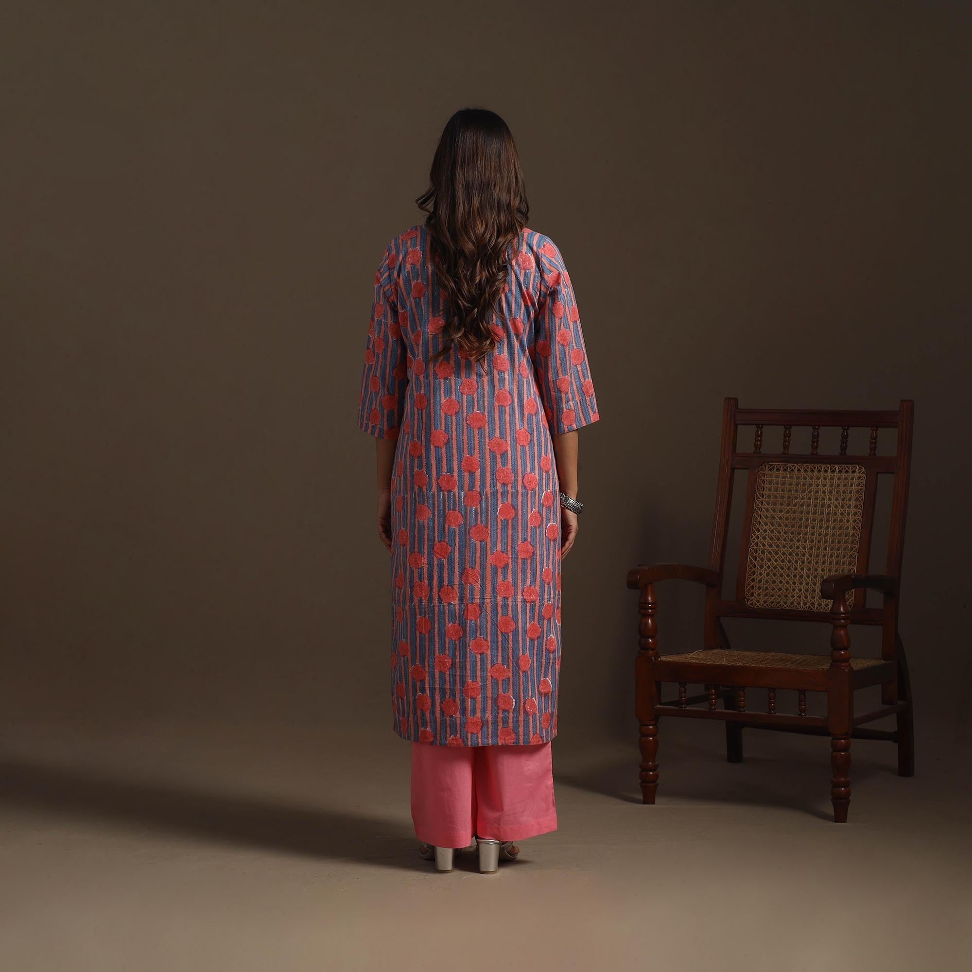 Pink hand block print straight sanganeri kurta for women. Crafted from soft cotton, it features delicate floral motifs inspired by the traditional craft of Sanganer, Rajasthan. Designed for a relaxed fit with a practical side pocket, it’s ideal for both casual outings and intimate gatherings.