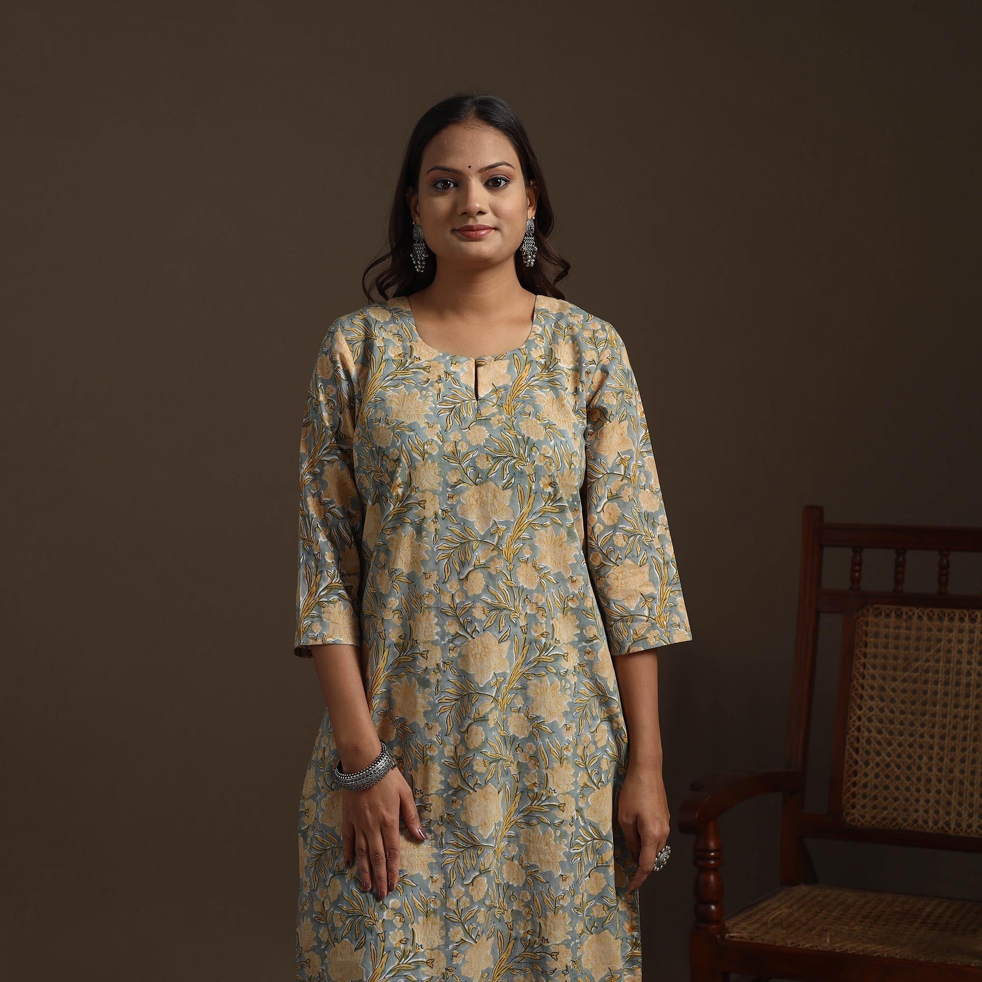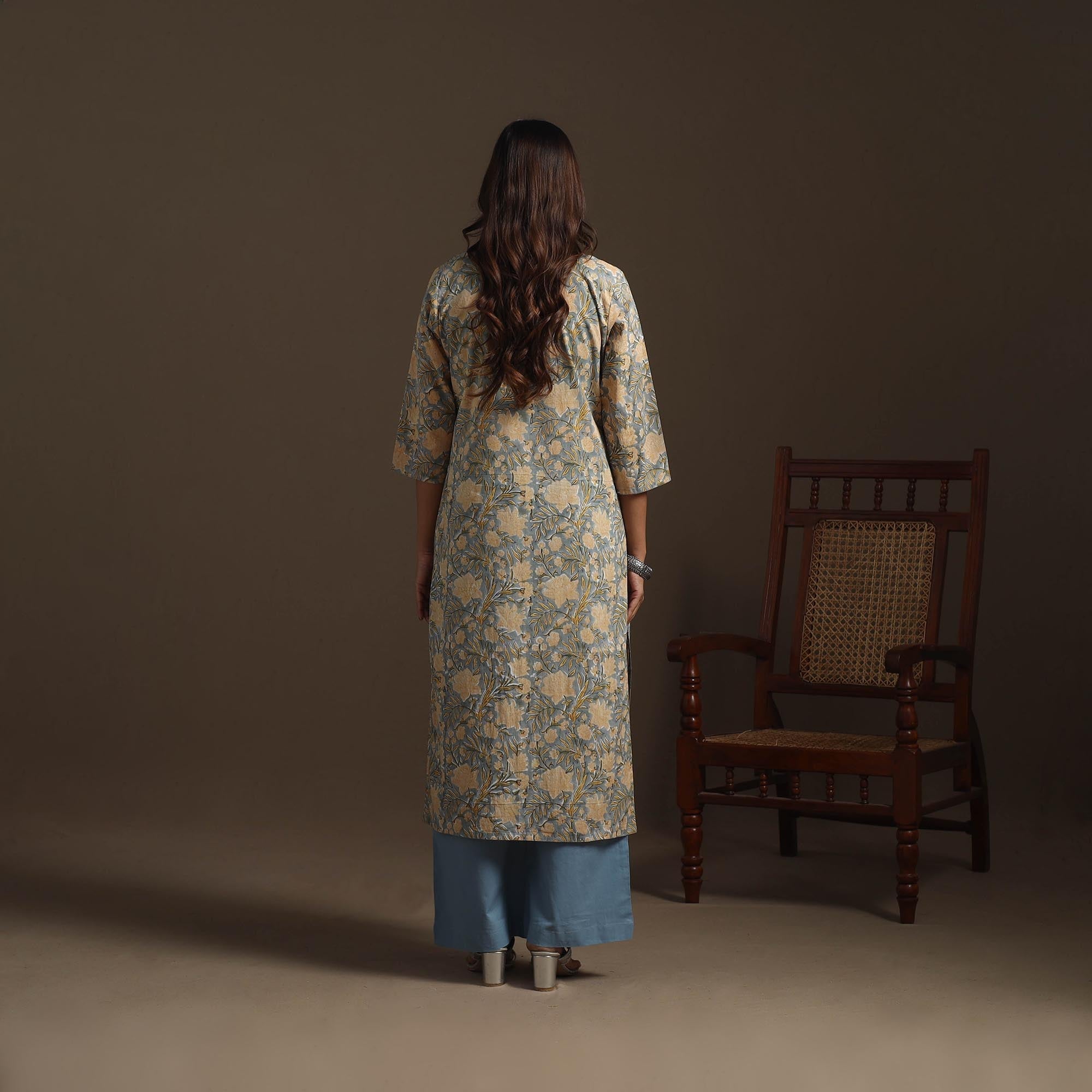 Grey hand block print straight sanganeri kurta for women. Crafted from soft cotton, it features delicate floral motifs inspired by the traditional craft of Sanganer, Rajasthan. Designed for a relaxed fit with a practical side pocket, it’s ideal for both casual outings and intimate gatherings.
