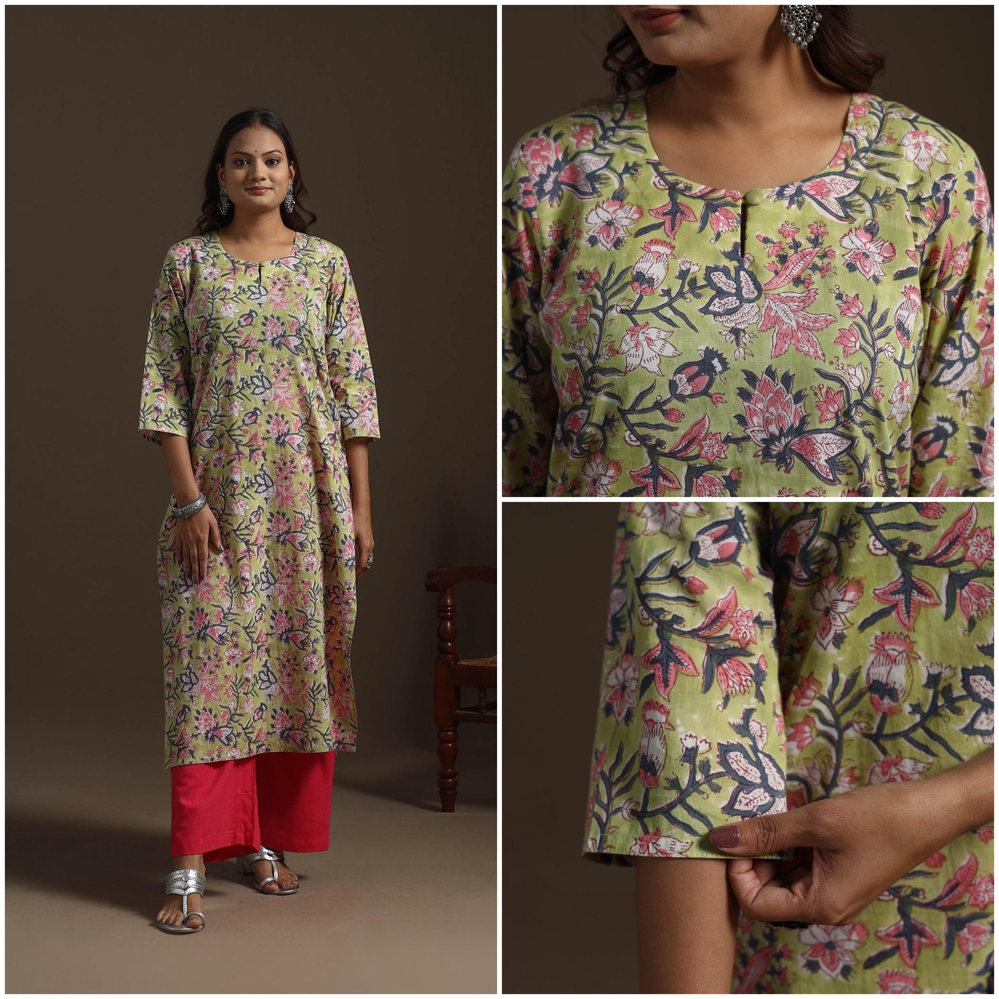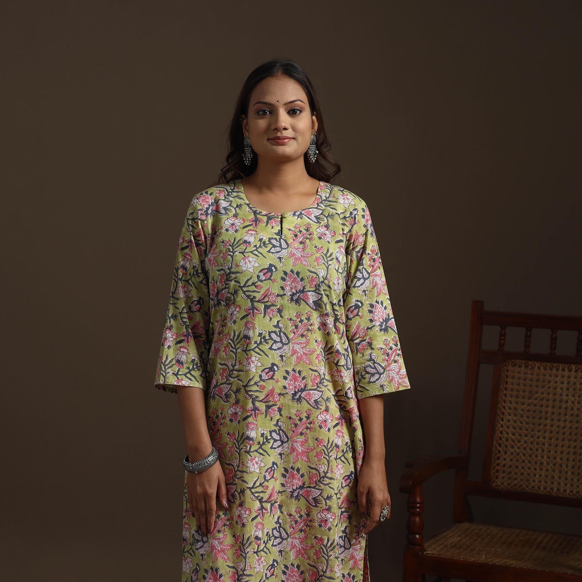 Green hand block print straight sanganeri kurta for women. Crafted from soft cotton, it features delicate floral motifs inspired by the traditional craft of Sanganer, Rajasthan. Designed for a relaxed fit with a practical side pocket, it’s ideal for both casual outings and intimate gatherings.