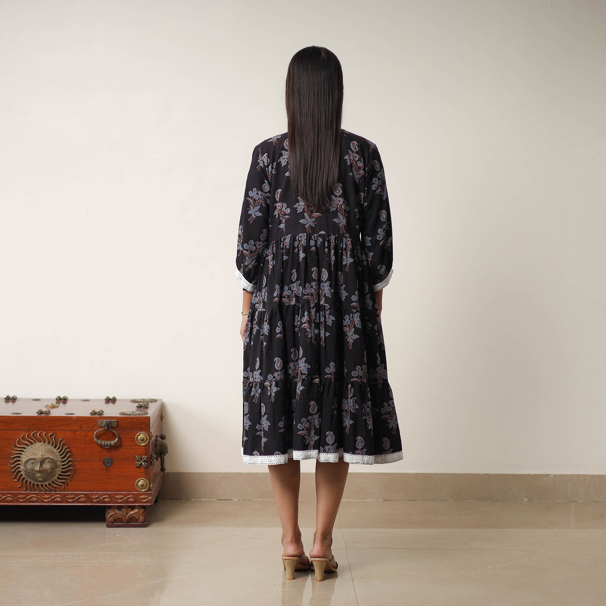 Step into the timeless elegance of our black hand block print cotton ajrakh dress with lace work, crafted from natural dyed cotton for comfort and breathability. This flared dress features intricate traditional motifs inspired by the cultural heritage of Gujarat and Rajasthan. Ideal for both daily wear and special occasions, it’s perfect for showcasing your love for sustainable, artisanal fashion.