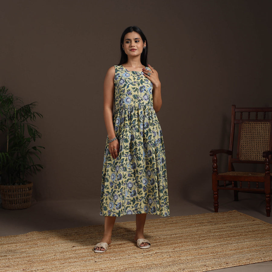 This yellow hand block print sleeveless flared sanganeri dress beautifully combines tradition with comfort. Featuring delicate sanganeri block prints from Rajasthan, it showcases vibrant motifs that bring charm to everyday wear. The sleeveless flared silhouette is light, airy, and easy to carry through the day, making it perfect for casual outings, office wear, or relaxed gatherings.