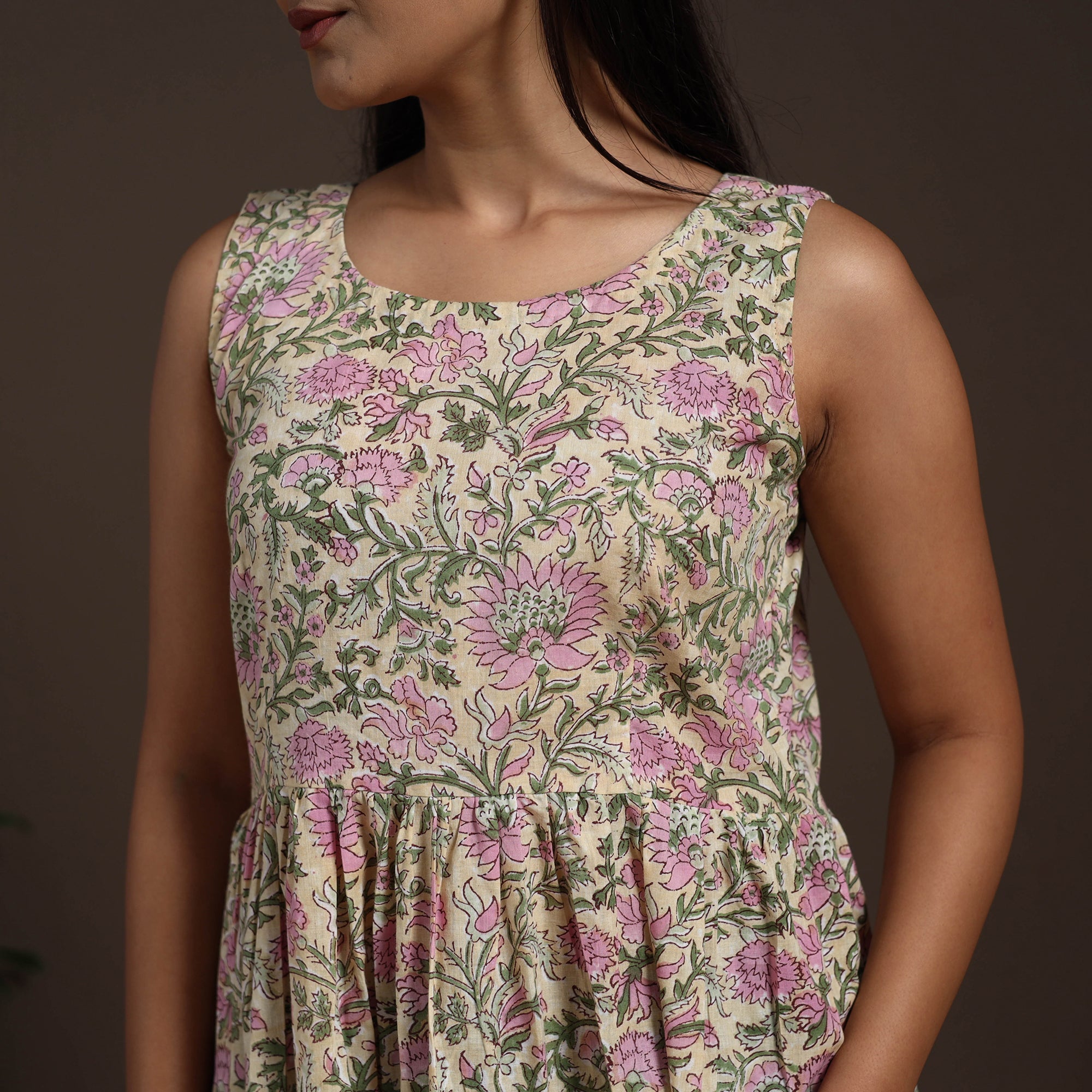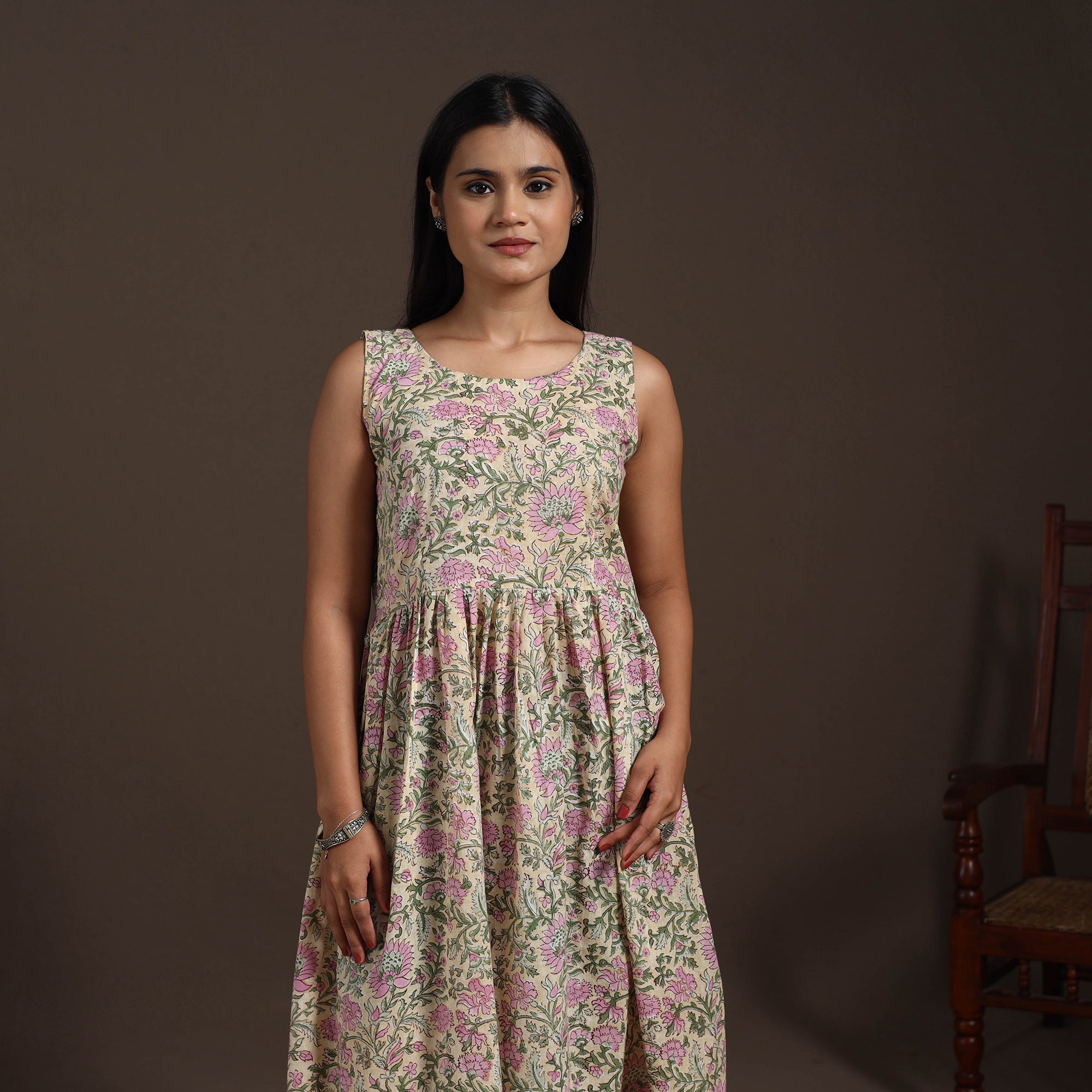 This beige hand block print sleeveless flared sanganeri dress beautifully combines tradition with comfort. Featuring delicate sanganeri block prints from Rajasthan, it showcases vibrant motifs that bring charm to everyday wear. The sleeveless flared silhouette is light, airy, and easy to carry through the day, making it perfect for casual outings, office wear, or relaxed gatherings.