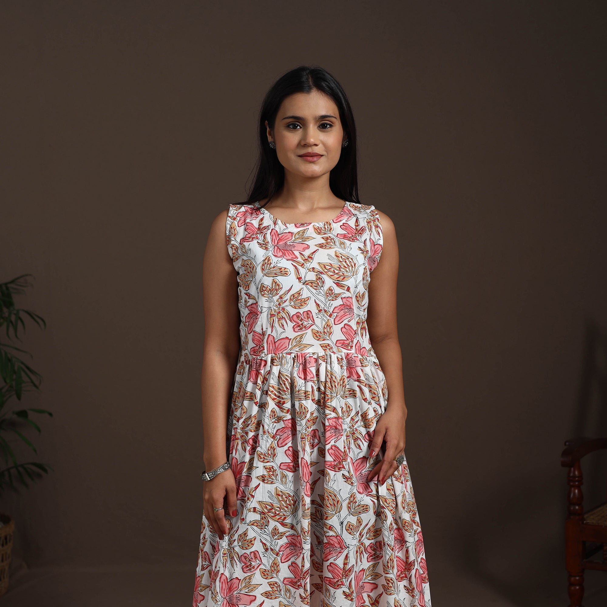 This white hand block print sleeveless flared sanganeri dress beautifully combines tradition with comfort. Featuring delicate sanganeri block prints from Rajasthan, it showcases vibrant motifs that bring charm to everyday wear. The sleeveless flared silhouette is light, airy, and easy to carry through the day, making it perfect for casual outings, office wear, or relaxed gatherings.