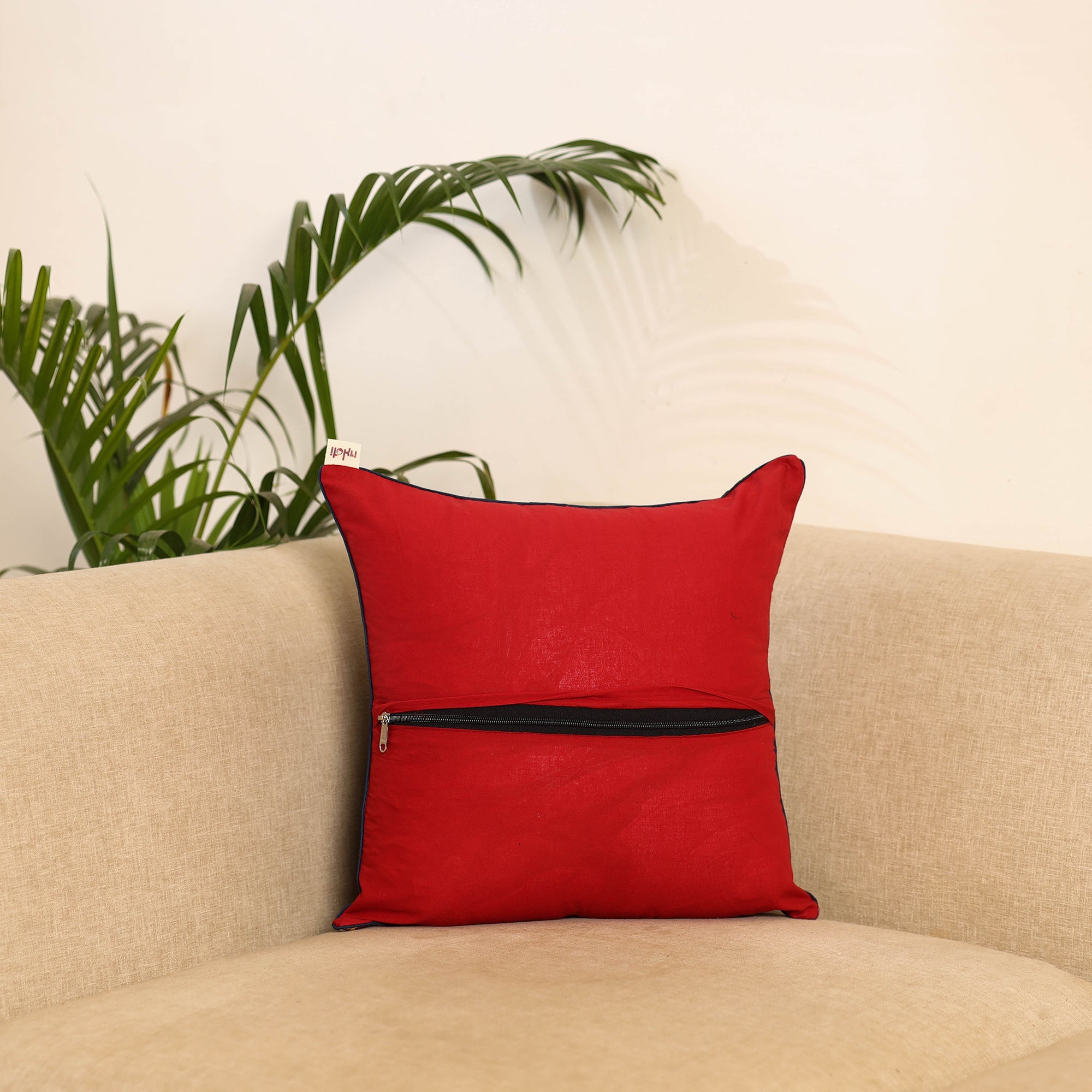 Red hand block print kalamkari cushion cover, crafted from cotton and traditional Indian handmade textiles. It blends artistry with comfort, making it perfect for your sofa, bed or lounge area.