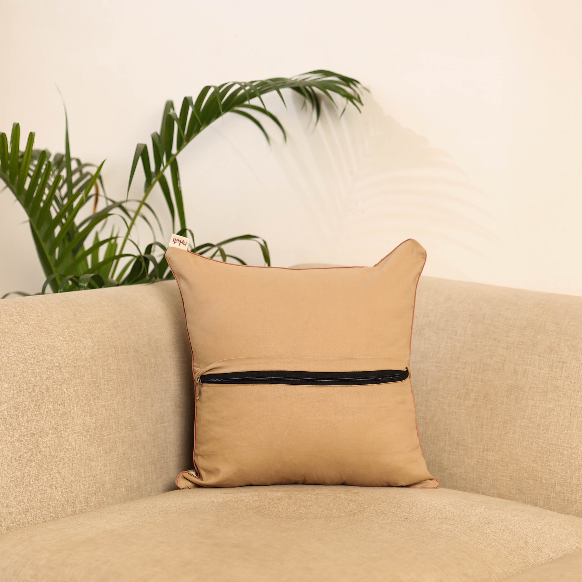 Beige hand block print kalamkari cushion cover, crafted from cotton and traditional Indian handmade textiles. It blends artistry with comfort, making it perfect for your sofa, bed or lounge area.