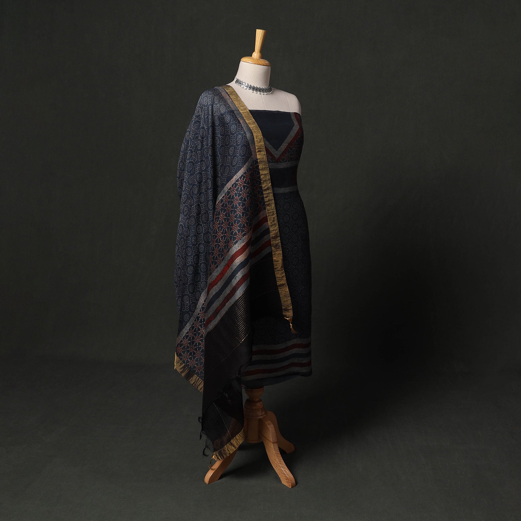 | Material | Blue ajrakh hand block print natural dyed linen silk 2pc unstitched dress material from Kutch, Gujarat, and is created using traditional block printing techniques by master artisan Salik A. Jabbar Khatri. Ajrakh is a textile tradition dating back over 4,500 years, known for its intricate geometric patterns developed through multiple stages of printing and dyeing. Made with weft: 60 denier linen and warp: 20/22 denier silk, this set includes kurta fabric paired with matching zari border dupatta, making it suitable for special occasions as well as everyday wear. |