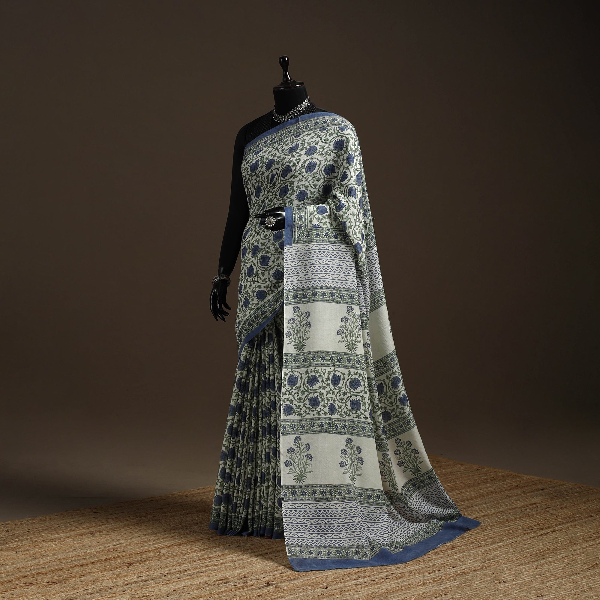 Hand Block Print Merino Wool Sanganeri Saree 04