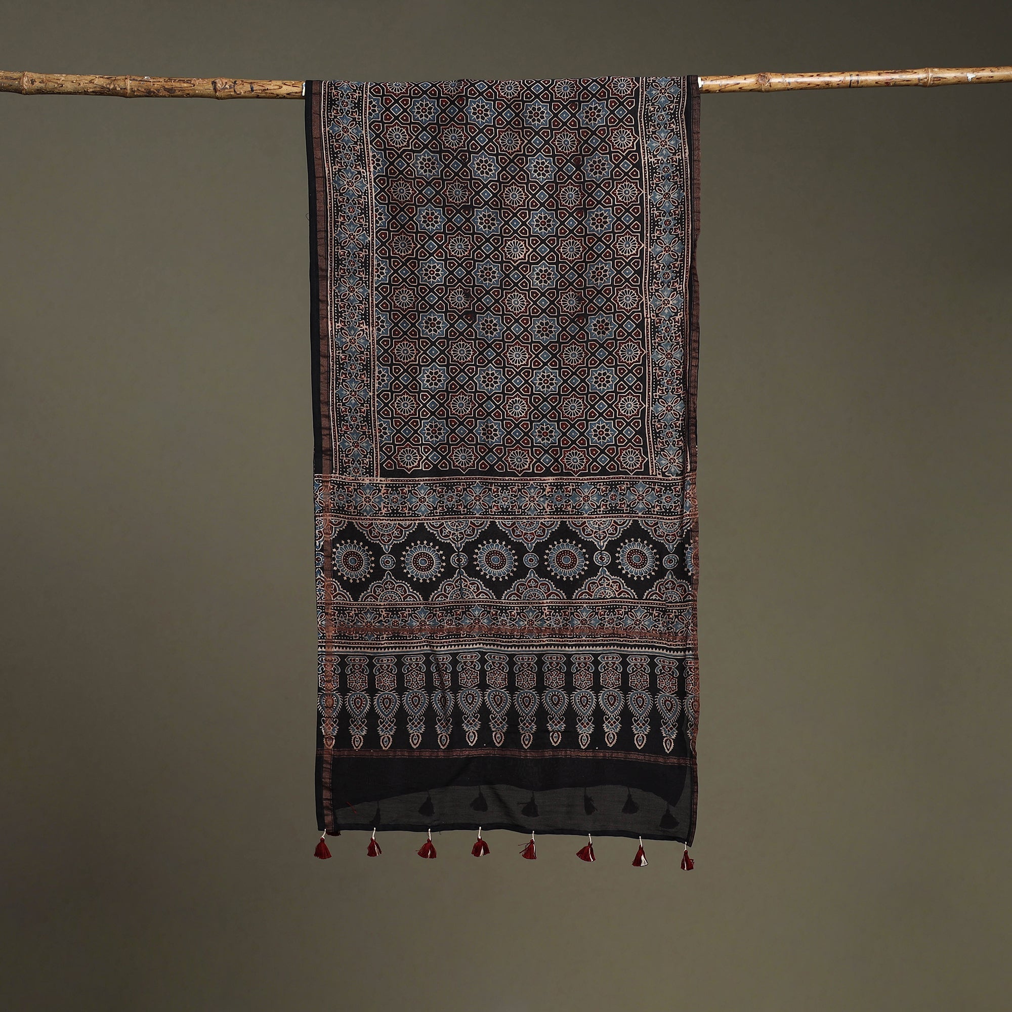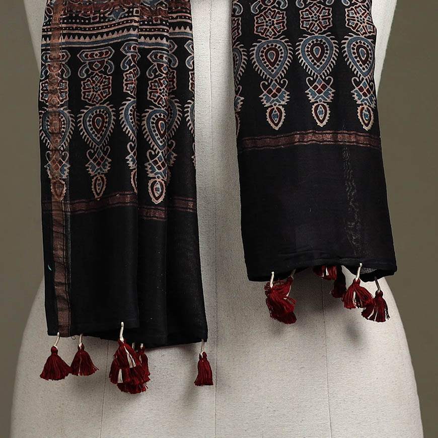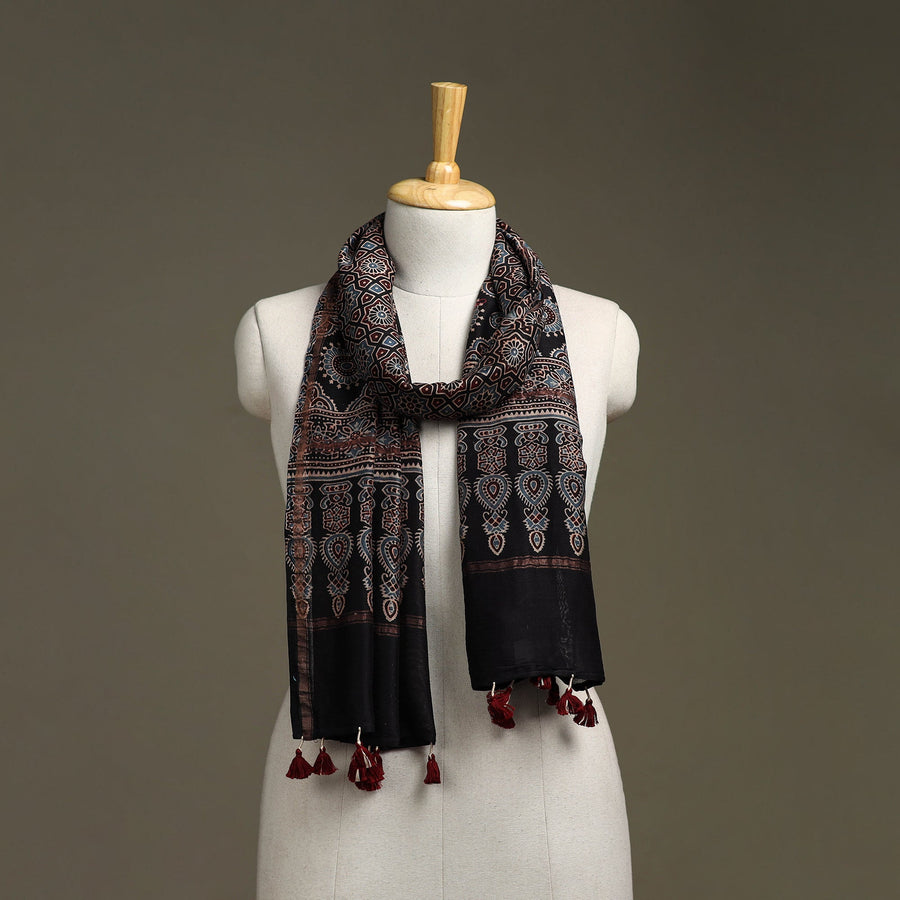 Black ajrakh hand block print chanderi silk cotton stole with zari border and tassels by Riyaz Abdulmajid Khatri, crafted using traditional natural-dyeing and resist block-printing techniques practiced for generations in the Kutch region. This ancient craft is estimated to be around 4,500 years old, known for its deep, earthy colours and ethnic motif. The printing process is long and intricate, involving multiple stages of washing, dyeing and resist application. This stole is suitable for occasions, casual outings or adding a touch of elegance to everyday wear.