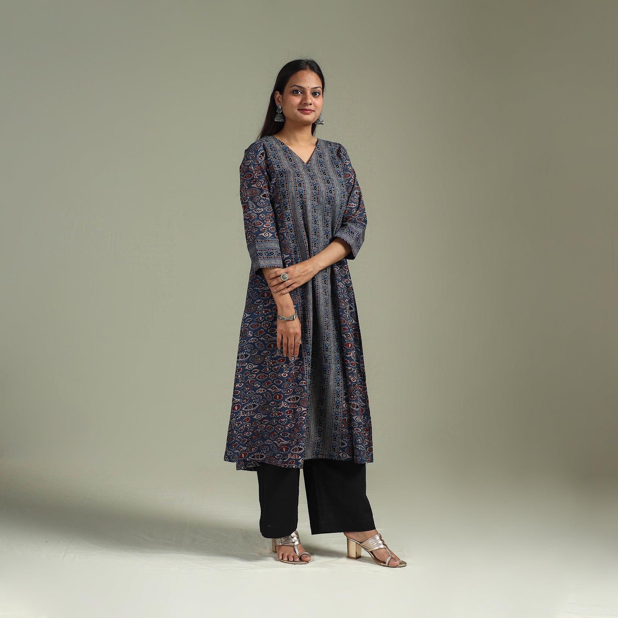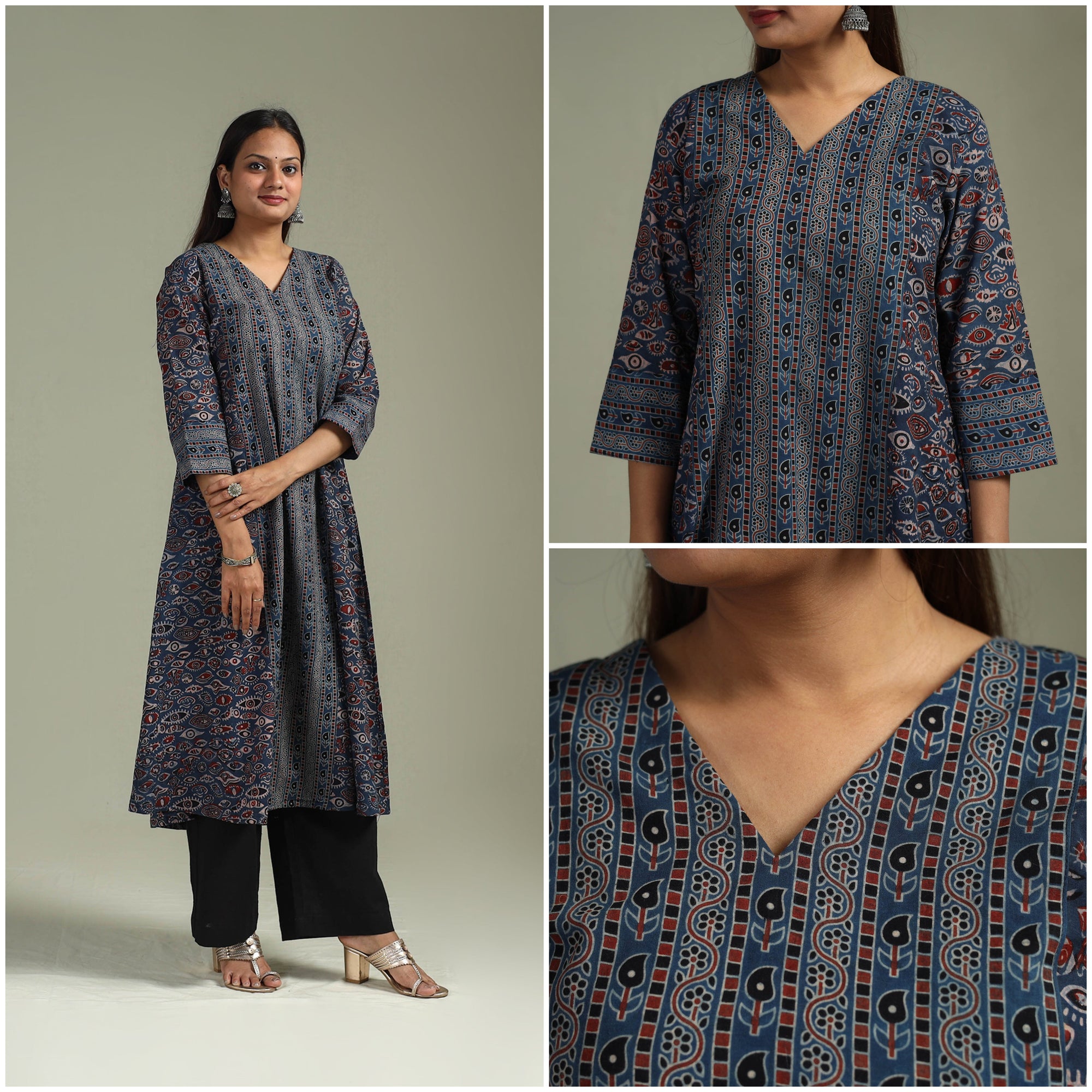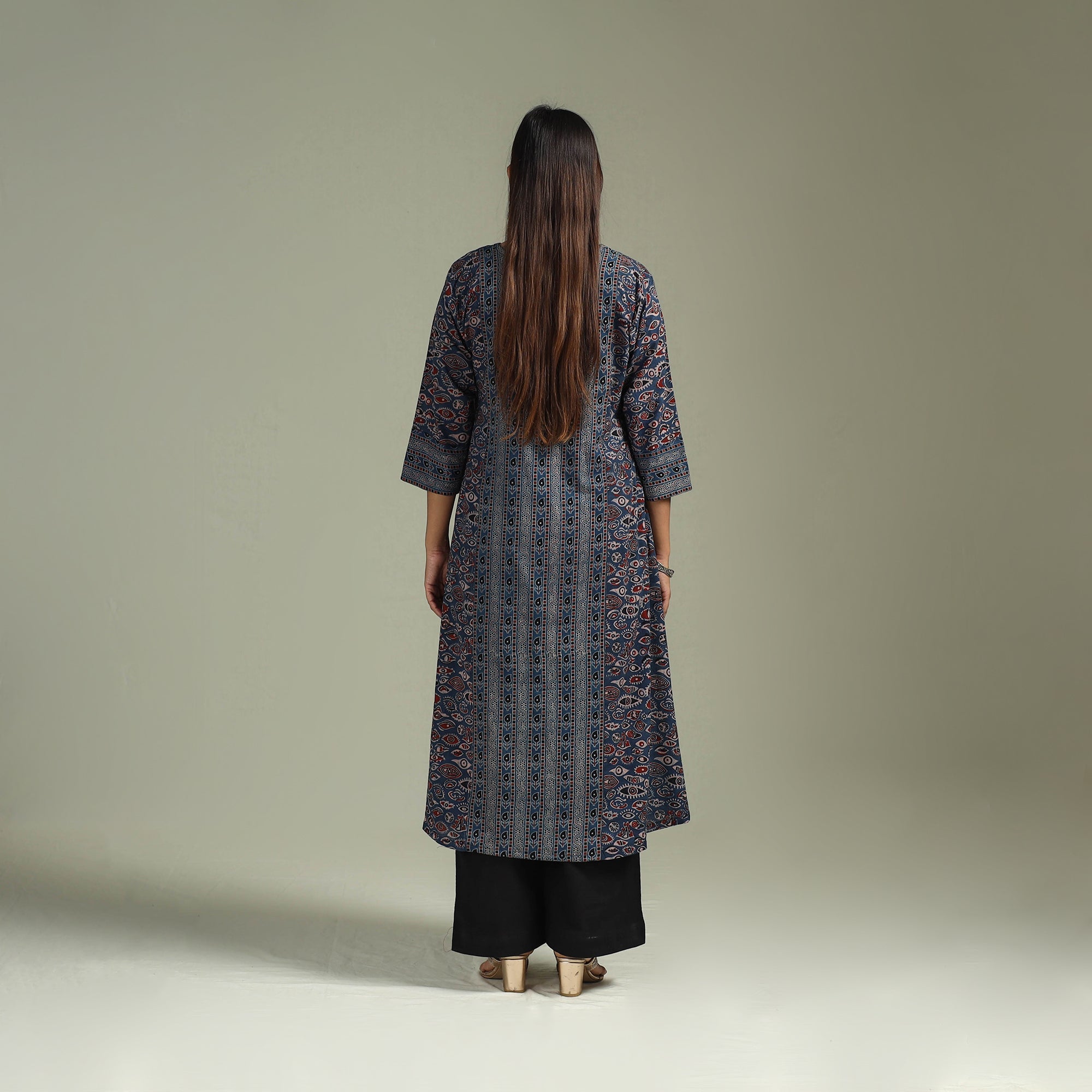 • Hand block print natural dyed cotton a-line ajrakh kurta