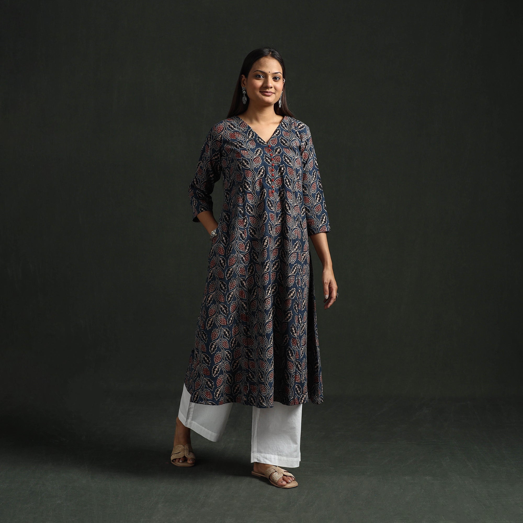 Ajrakh hand block print A-line kurta for women. Made from naturally dyed pure cotton using the traditional resist block printing technique, this ancient craft is estimated to be over 4,500 years old. The breathable fabric keeps you comfortable throughout the day, while the functional side pocket adds convenience. Suitable for office wear, casual outings and weekend plans.