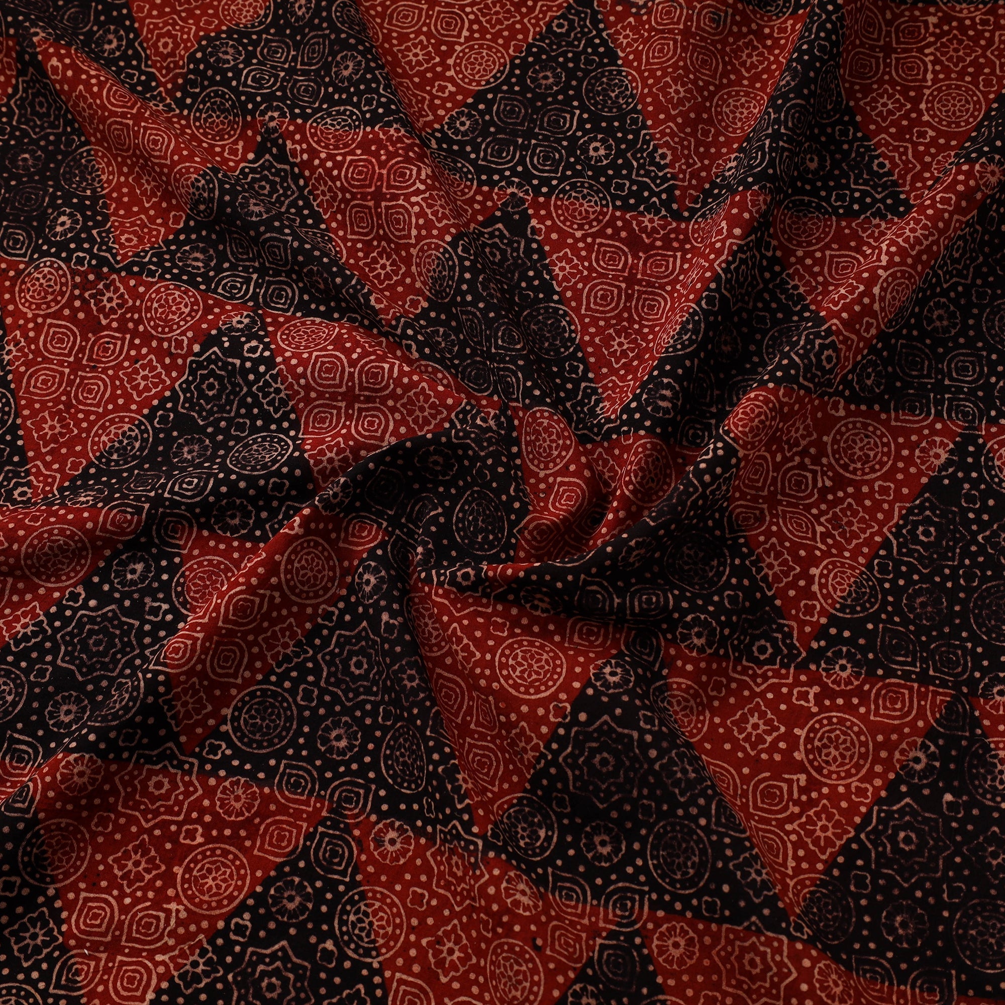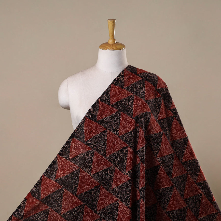Red ajrakh hand block print cotton fabric by Riyaz Abdulmajid Khatri crafted using natural dyeing and resist block-printing techniques. This ancient craft is estimated to be around 4,500 years old. The Ajrakh artisans in India originally migrated from Sindh to the Kutch region of Gujarat and to Barmer in Rajasthan. Ajrakh is also the traditional attire of the Maldhari pastoral community of Bhuj. The process is long and detailed, involving multiple stages where each layer of colour is printed only after a resting period, allowing the cloth to absorb the dye fully. Made from pure cotton it is ideal for creating kurtas, shirts, dresses or even home decor items.