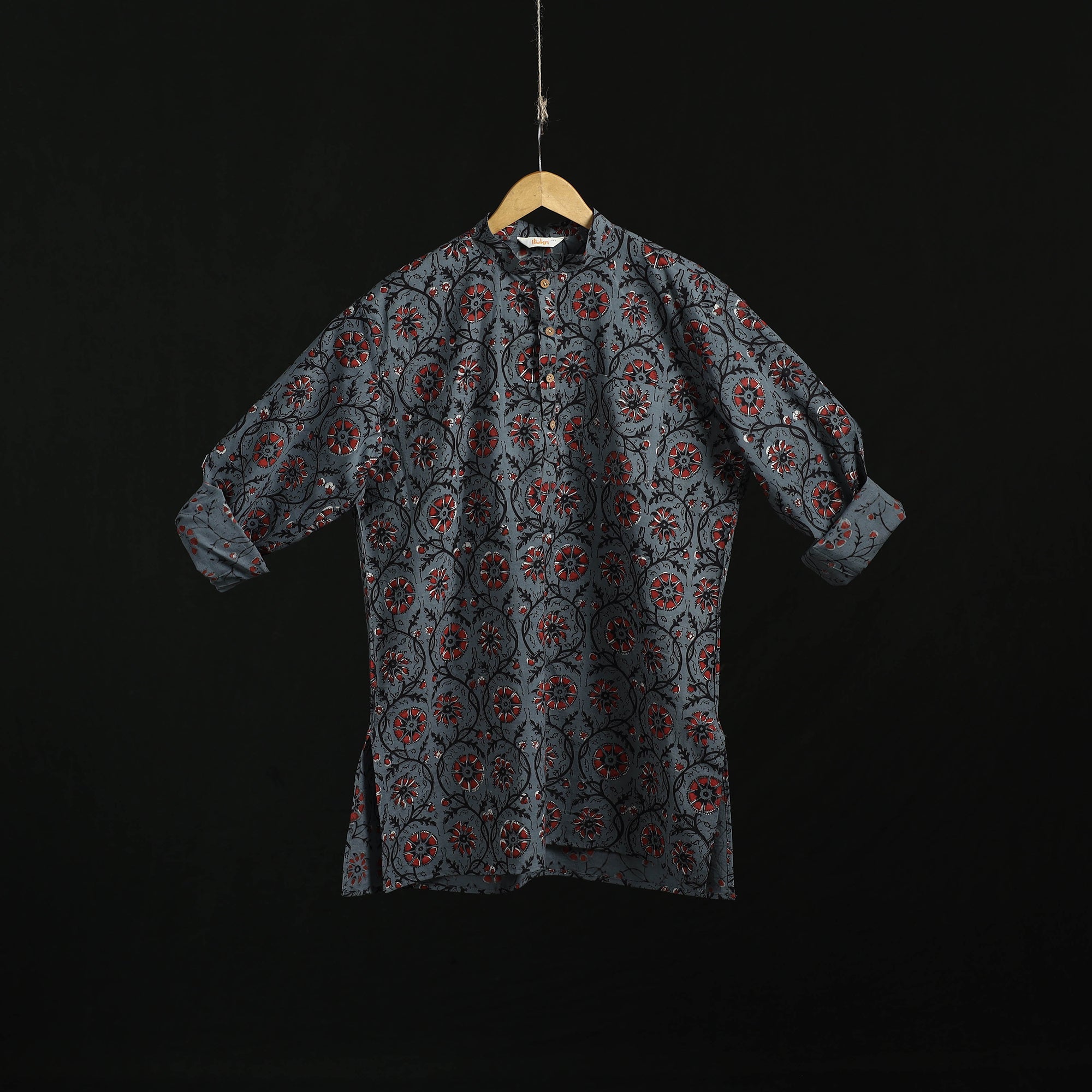 | Material | Bagru hand block print natural dyed short kurta for men. Bagru printing is a traditional craft from Rajasthan, practiced for over 400–450 years using the mud-resist technique. Made from breathable cotton, the kurta features full sleeves, a front button placket with a chinese collar, and a practical front pocket, making it suitable for daily wear and relaxed casual outings. A Note on Handmade Beauty: |