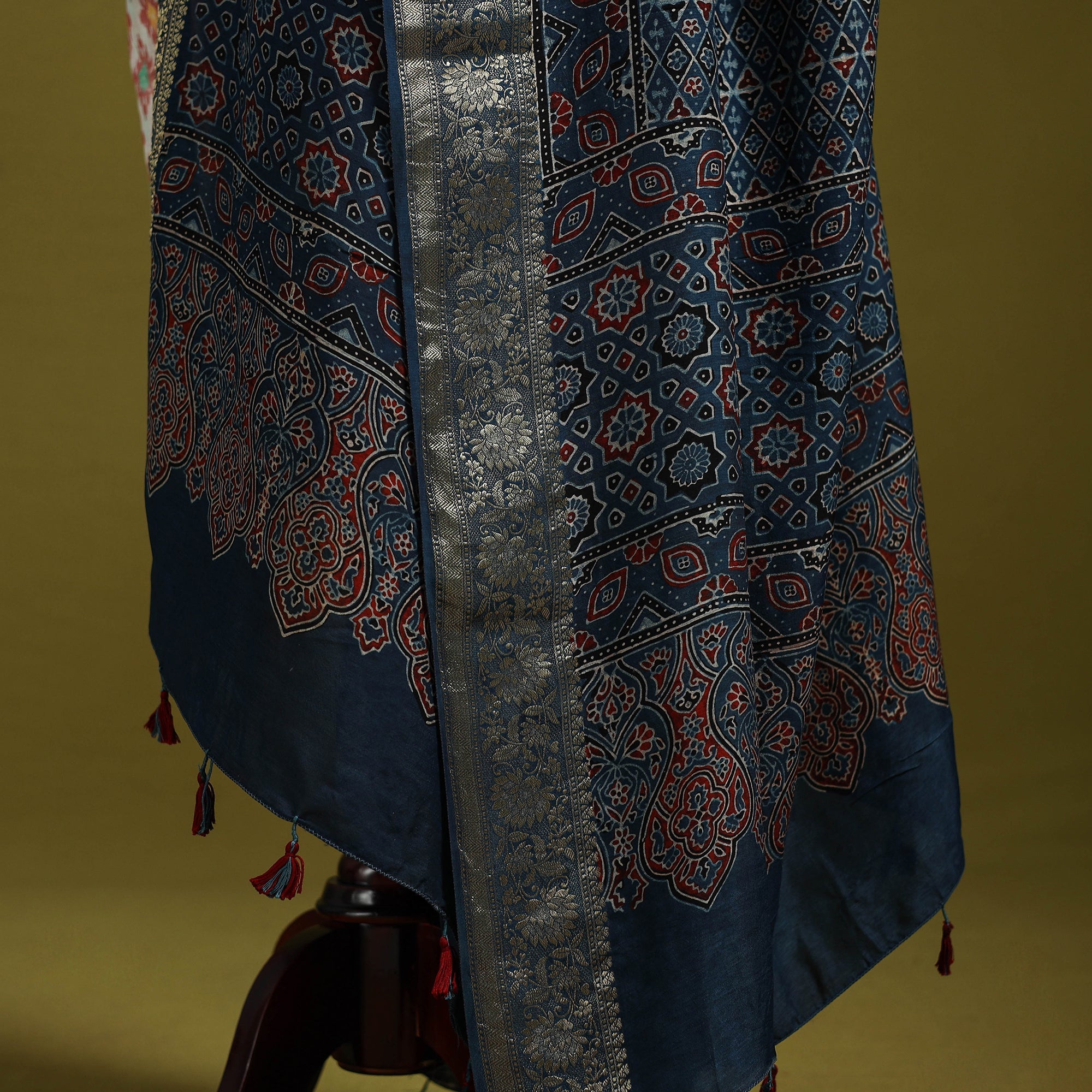 • Blue - Hand Block Print Natural Dyed Dola Silk Zari Border Ajrakh Dupatta with Tassels 02