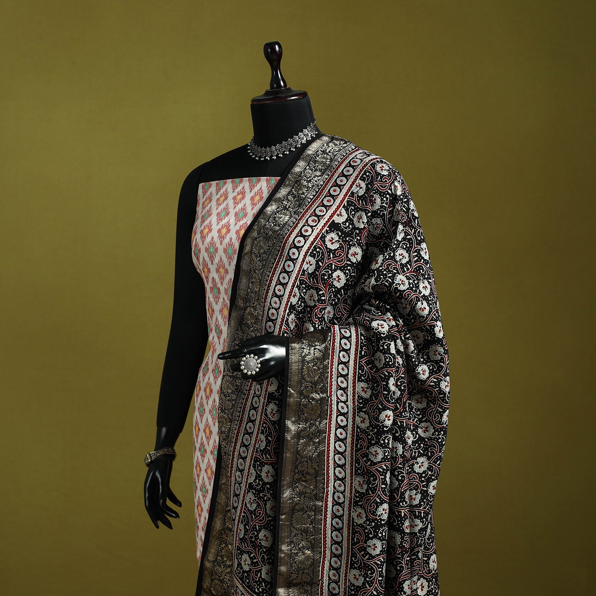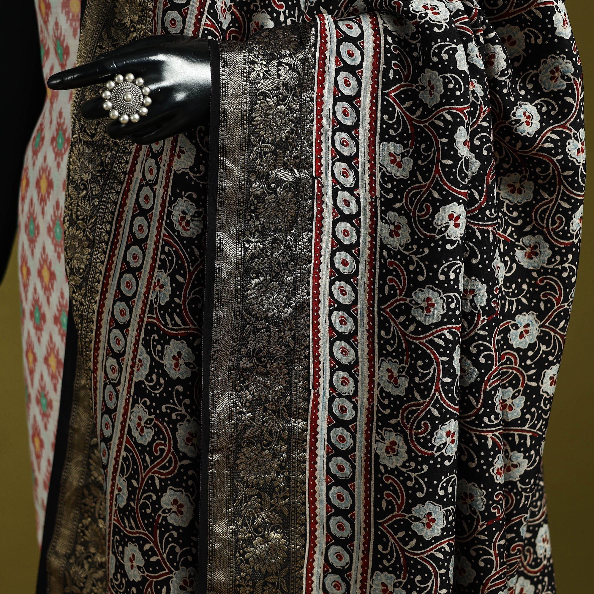 | Material | Black ajrakh dola art silk dupatta is hand-block printed in Kutch using natural dyes. Each motif is carefully placed using traditional Ajrakh wooden blocks, giving the fabric its detailed, balanced pattern. The dupatta features a zari border and tassels that add a polished finish. Easy to drape and style, it pairs well with everyday outfits as well as festive wear, adding subtle elegance to any look. A Note on Handmade Beauty |