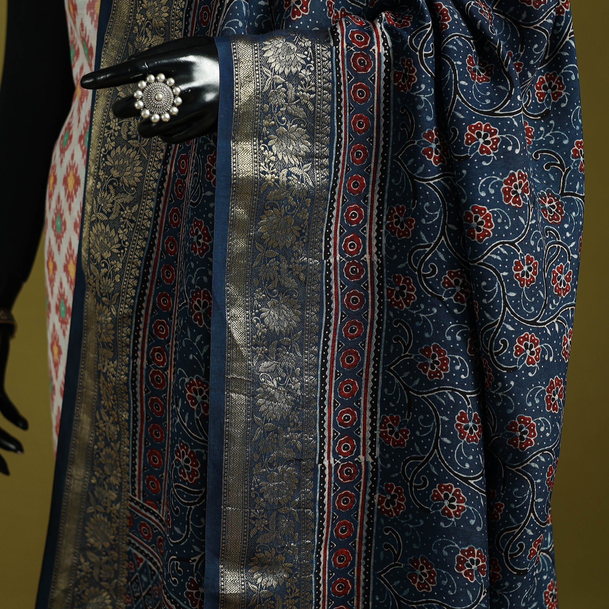 • Blue - Hand Block Print Natural Dyed Dola Silk Zari Border Ajrakh Dupatta with Tassels 14
