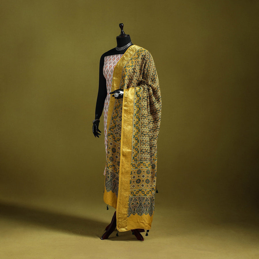 Yellow ajrakh dola art silk dupatta is hand-block printed in Kutch using natural dyes. Each motif is carefully placed using traditional Ajrakh wooden blocks, giving the fabric its detailed, balanced pattern. The dupatta features a zari border and tassels that add a polished finish. Easy to drape and style, it pairs well with everyday outfits as well as festive wear, adding subtle elegance to any look.