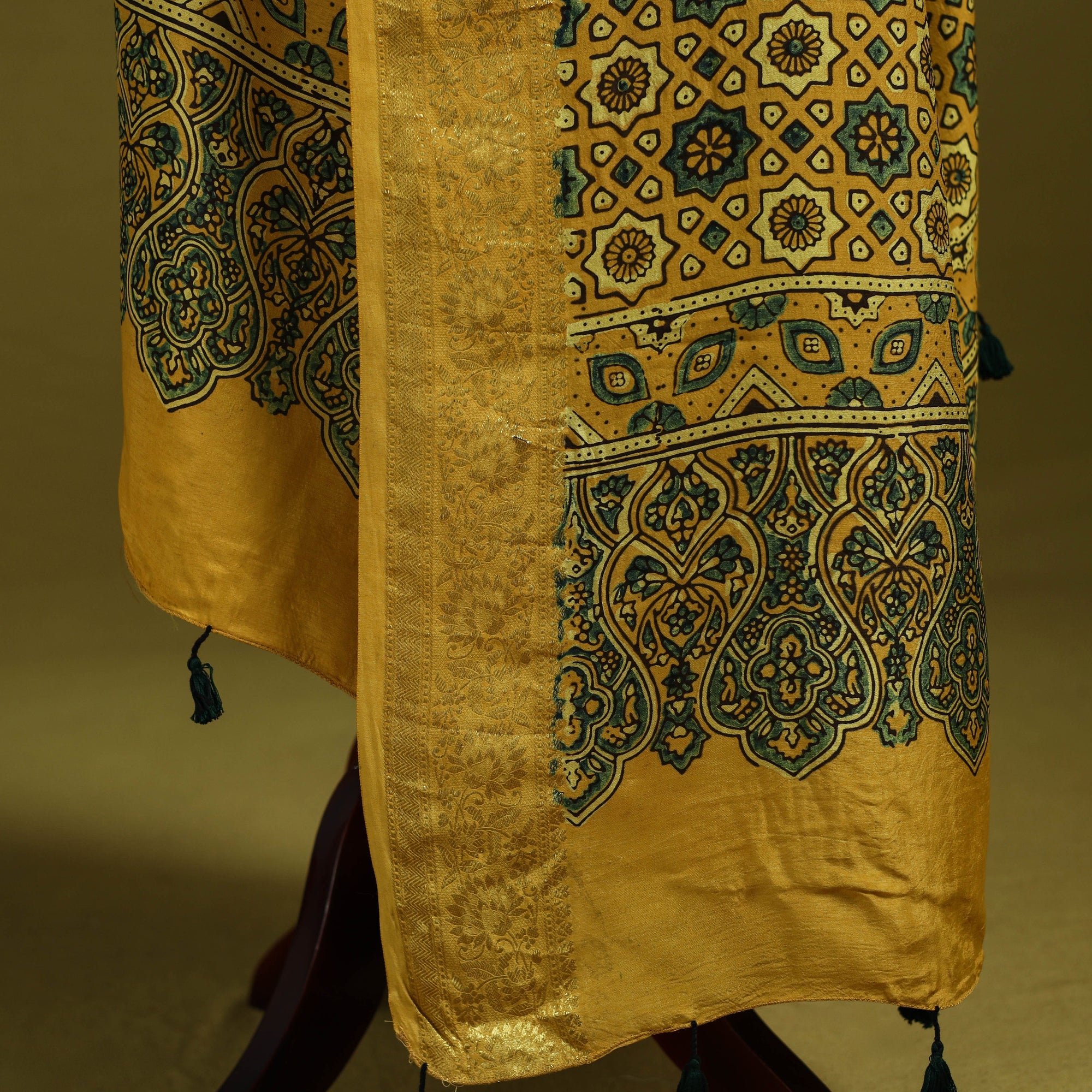 • Yellow - Hand Block Print Natural Dyed Dola Silk Zari Border Ajrakh Dupatta with Tassels 18