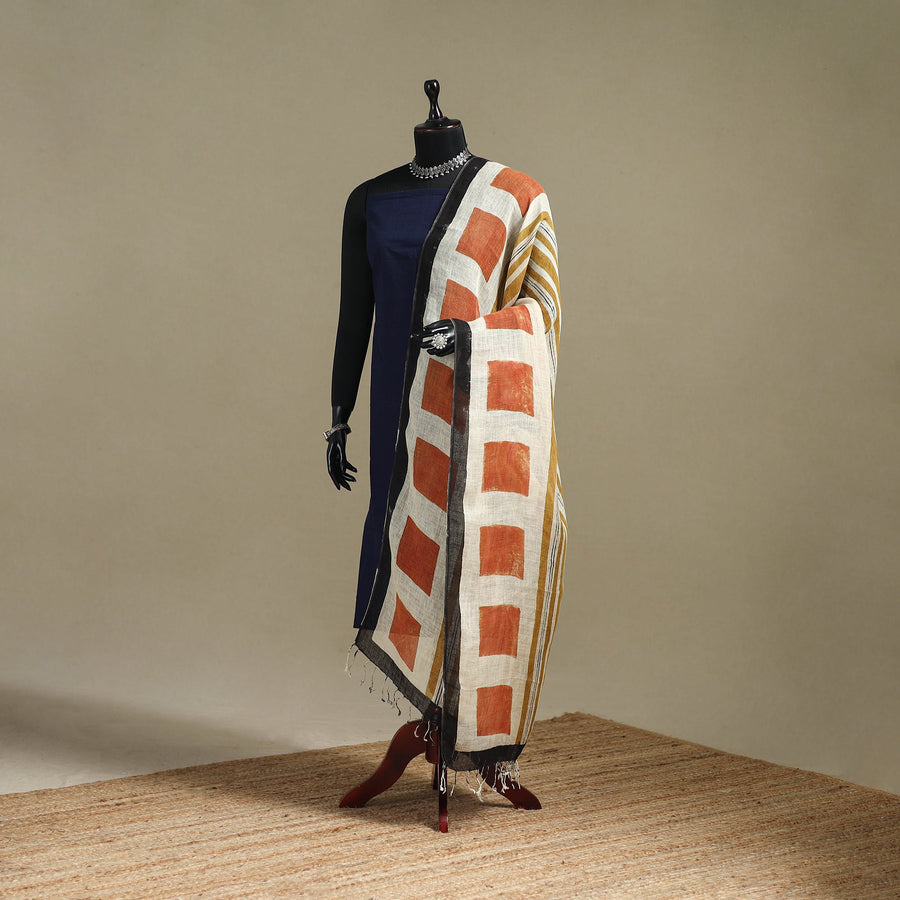 • White - Hand Block Print Natural Dyed Linen Ajrakh Dupatta with Tassels 05