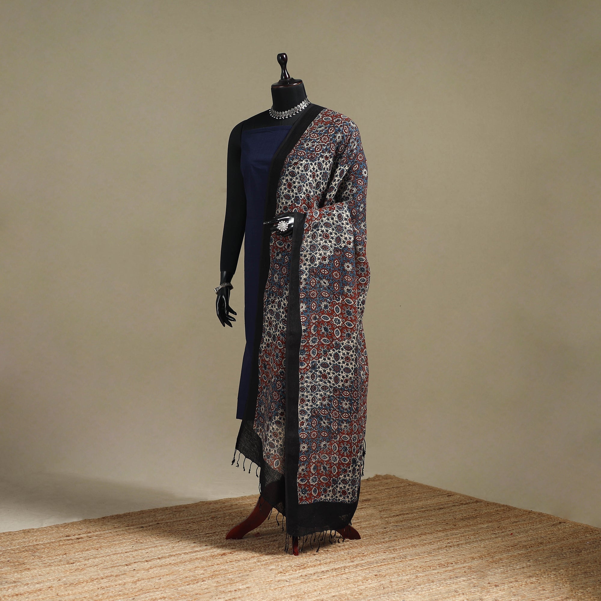 Black ajrakh dupatta is hand-block printed in Kutch using natural dyes. Each motif is carefully placed with traditional Ajrakh wooden blocks, creating a detailed and balanced pattern. Made from a linen–cotton blend, it has a smooth feel and a structured drape. The dupatta features tassels that add a refined finish. Easy to drape and style, it pairs well with everyday outfits as well as festive wear, bringing subtle elegance to any look.
