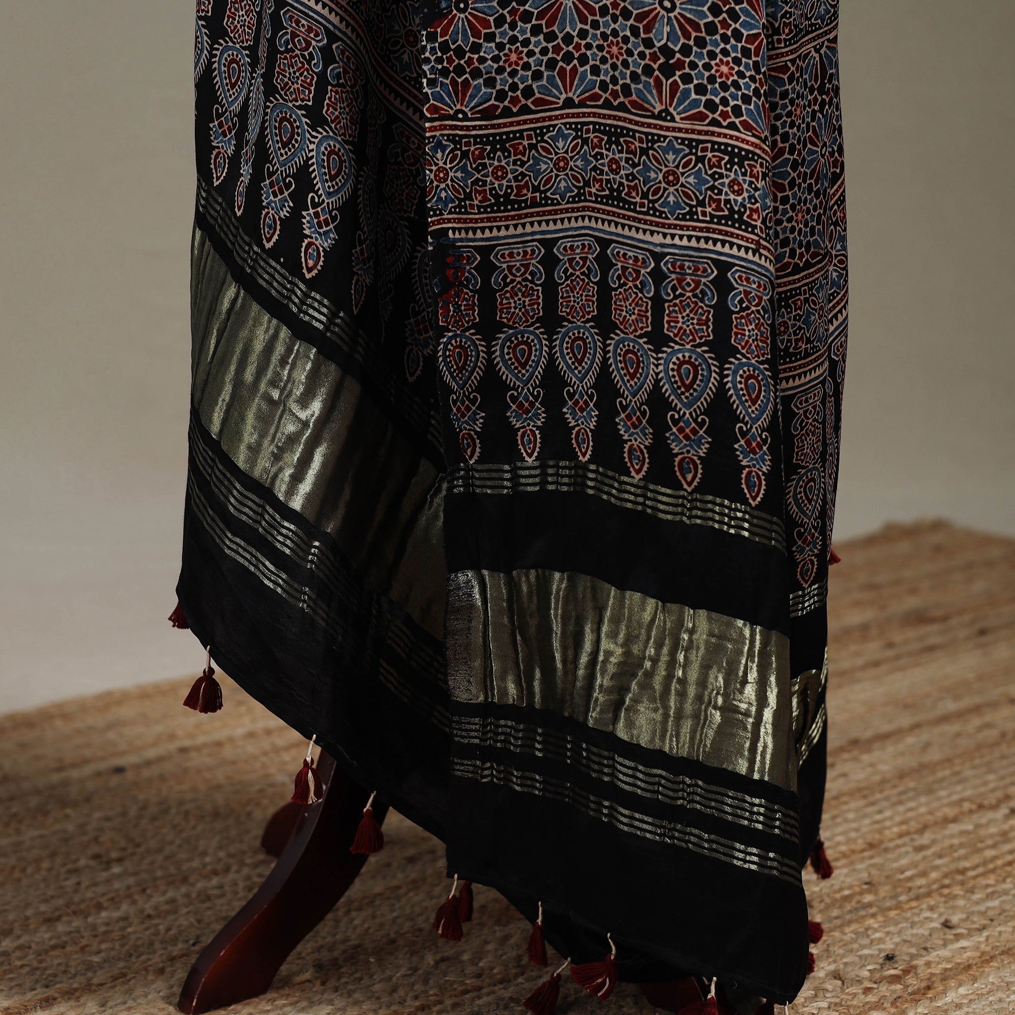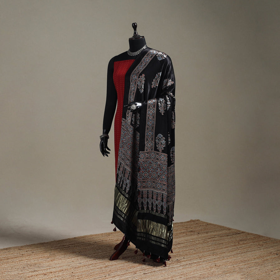 Ajrakh modal silk dupatta with lagdi patta and tassels by Riyaz Abdulmajid Khatri, crafted using traditional natural-dyeing and resist block-printing techniques practiced for generations in the Kutch region. This ancient craft is estimated to be around 4,500 years old, known for its deep, earthy colours and ethnic motif. The printing process is long and intricate, involving multiple stages of washing, dyeing and resist application. This dupatta is suitable for occasions, casual outings or adding a touch of elegance to everyday wear.