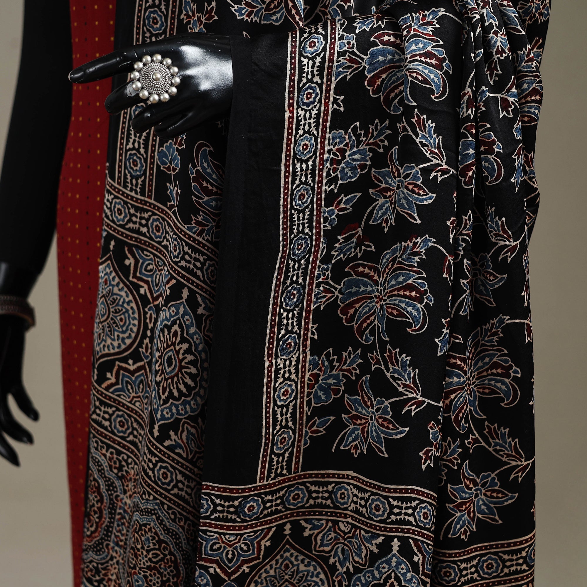 Ajrakh modal silk dupatta with lagdi patta and tassels by Riyaz Abdulmajid Khatri, crafted using traditional natural-dyeing and resist block-printing techniques practiced for generations in the Kutch region. This ancient craft is estimated to be around 4,500 years old, known for its deep, earthy colours and ethnic motif. The printing process is long and intricate, involving multiple stages of washing, dyeing and resist application. This dupatta is suitable for occasions, casual outings or adding a touch of elegance to everyday wear.