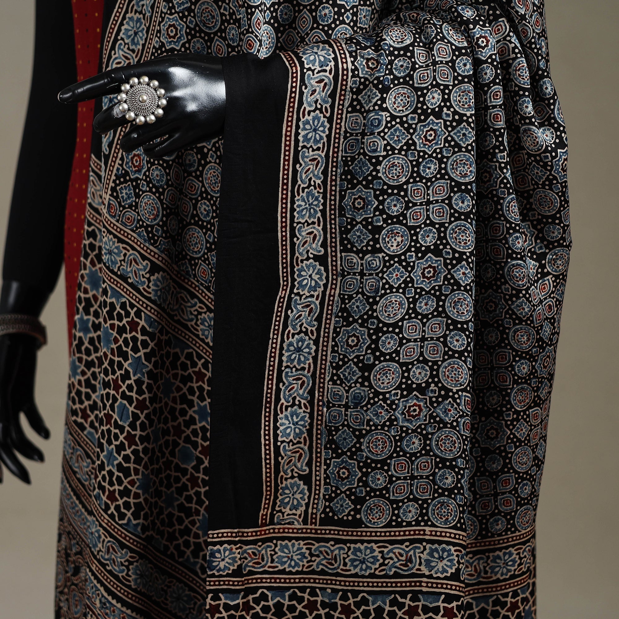 | Material | Black ajrakh modal silk dupatta with lagdi patta and tassels by Riyaz Abdulmajid Khatri, crafted using traditional natural-dyeing and resist block-printing techniques practiced for generations in the Kutch region. This ancient craft is estimated to be around 4,500 years old, known for its deep, earthy colours and ethnic motif. The printing process is long and intricate, involving multiple stages of washing, dyeing and resist application. This dupatta is suitable for occasions, casual outings or adding a touch of elegance to everyday wear. A Note on Handmade Beauty |