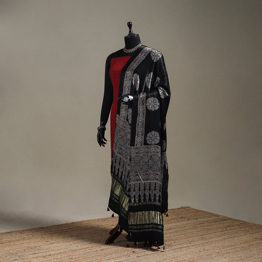 Ajrakh modal silk dupatta with lagdi patta and tassels by Riyaz Abdulmajid Khatri, crafted using traditional natural-dyeing and resist block-printing techniques practiced for generations in the Kutch region. This ancient craft is estimated to be around 4,500 years old, known for its deep, earthy colours and ethnic motif. The printing process is long and intricate, involving multiple stages of washing, dyeing and resist application. This dupatta is suitable for occasions, casual outings or adding a touch of elegance to everyday wear.