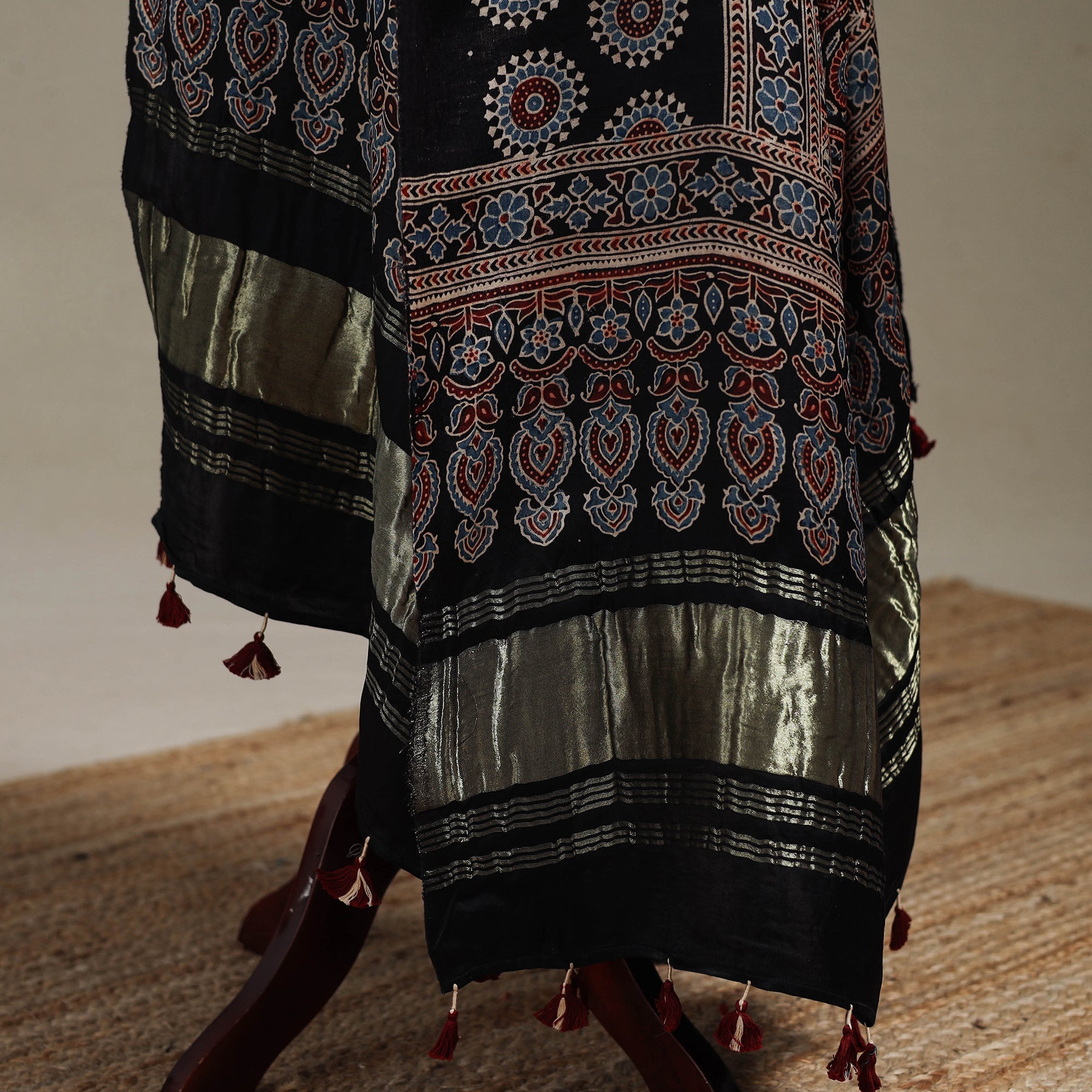 Ajrakh modal silk dupatta with lagdi patta and tassels by Riyaz Abdulmajid Khatri, crafted using traditional natural-dyeing and resist block-printing techniques practiced for generations in the Kutch region. This ancient craft is estimated to be around 4,500 years old, known for its deep, earthy colours and ethnic motif. The printing process is long and intricate, involving multiple stages of washing, dyeing and resist application. This dupatta is suitable for occasions, casual outings or adding a touch of elegance to everyday wear.