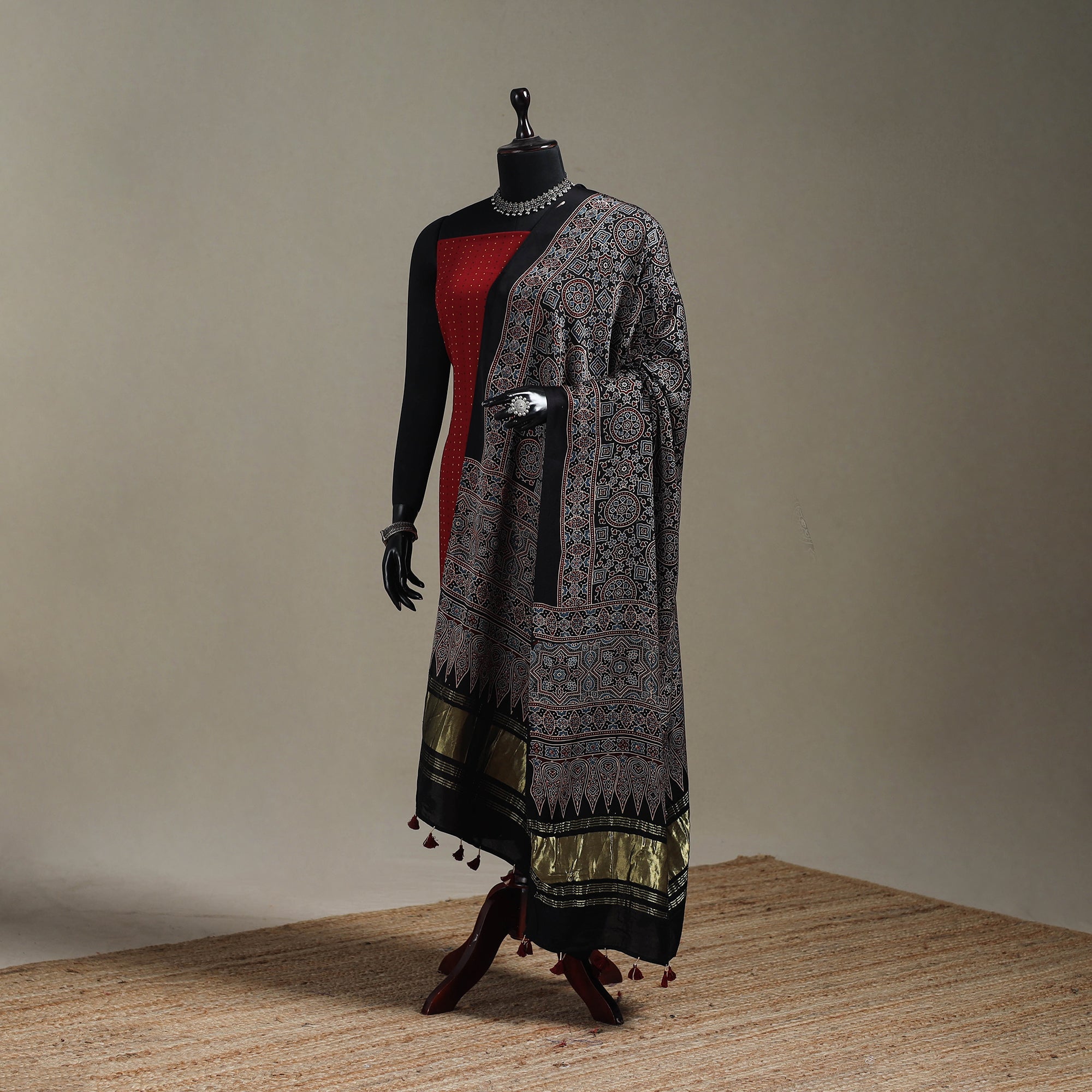 Ajrakh modal silk dupatta with lagdi patta and tassels by Riyaz Abdulmajid Khatri, crafted using traditional natural-dyeing and resist block-printing techniques practiced for generations in the Kutch region. This ancient craft is estimated to be around 4,500 years old, known for its deep, earthy colours and ethnic motif. The printing process is long and intricate, involving multiple stages of washing, dyeing and resist application. This dupatta is suitable for occasions, casual outings or adding a touch of elegance to everyday wear.