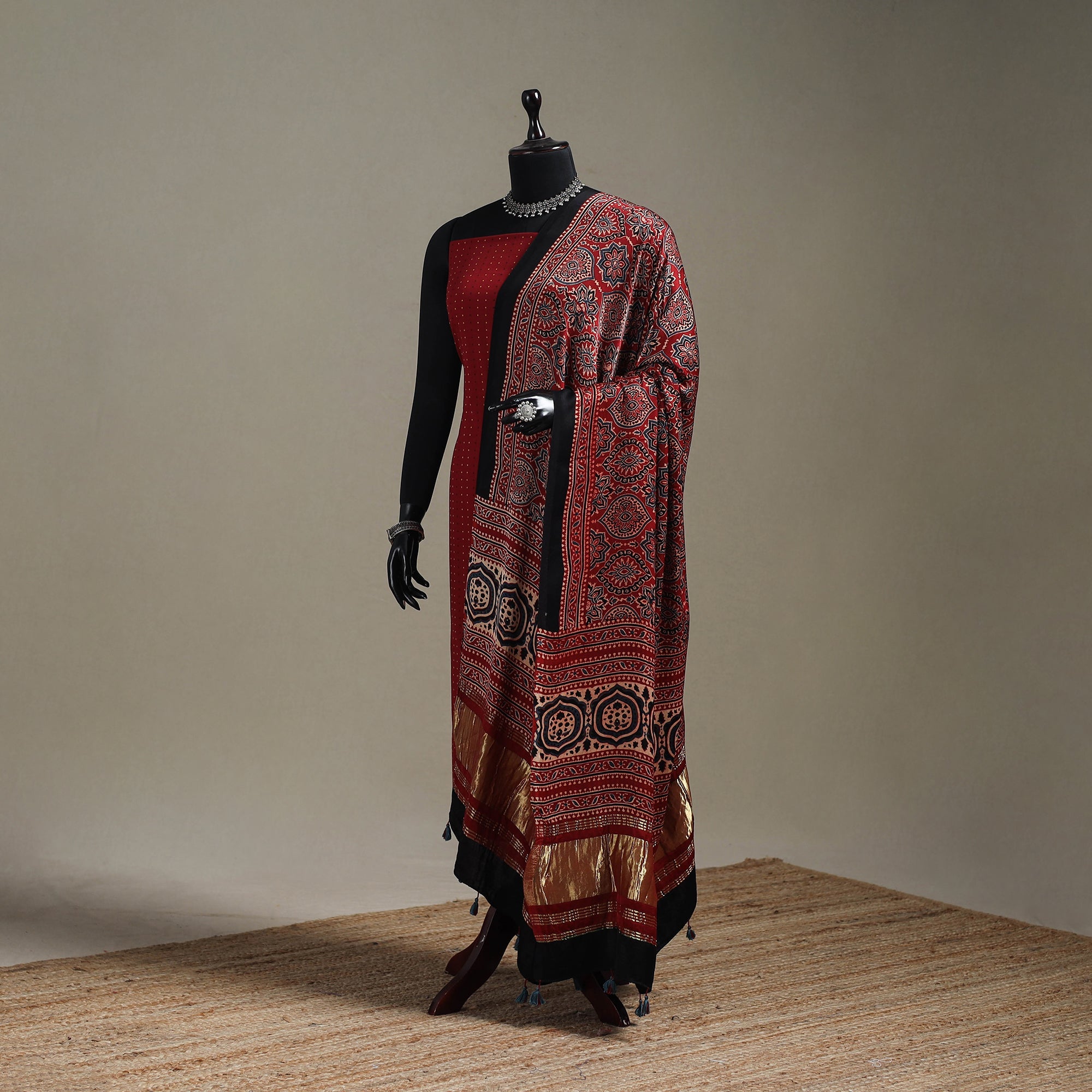 Ajrakh modal silk dupatta with lagdi patta and tassels by Riyaz Abdulmajid Khatri, crafted using traditional natural-dyeing and resist block-printing techniques practiced for generations in the Kutch region. This ancient craft is estimated to be around 4,500 years old, known for its deep, earthy colours and ethnic motif. The printing process is long and intricate, involving multiple stages of washing, dyeing and resist application. This dupatta is suitable for occasions, casual outings or adding a touch of elegance to everyday wear.
