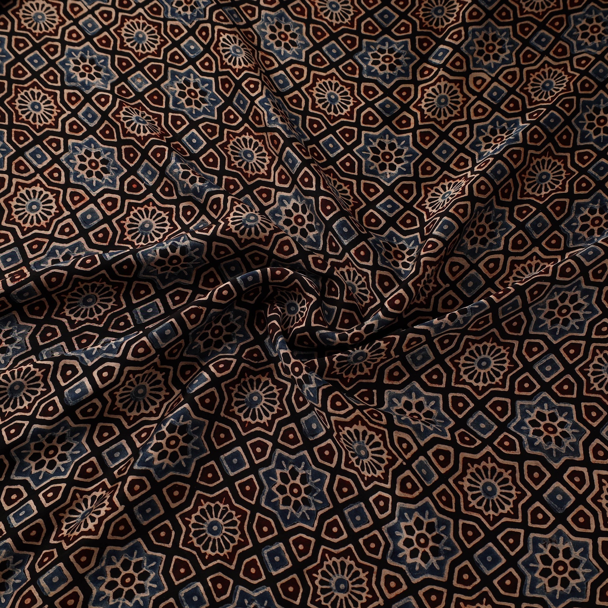 Black ajrakh hand block printed modal silk fabric by Riyaz Abdulmajid Khatri crafted using natural dyeing and resist block-printing techniques. This ancient craft is estimated to be around 4,500 years old. The Ajrakh artisans in India originally migrated from Sindh to the Kutch region of Gujarat and to Barmer in Rajasthan. Ajrakh is also the traditional attire of the Maldhari pastoral community of Bhuj. The process is long and detailed, involving multiple stages where each layer of colour is printed only after a resting period, allowing the cloth to absorb the dye fully. Made from modal silk it is ideal for creating kurtas, shirts, dresses or even home decor items.