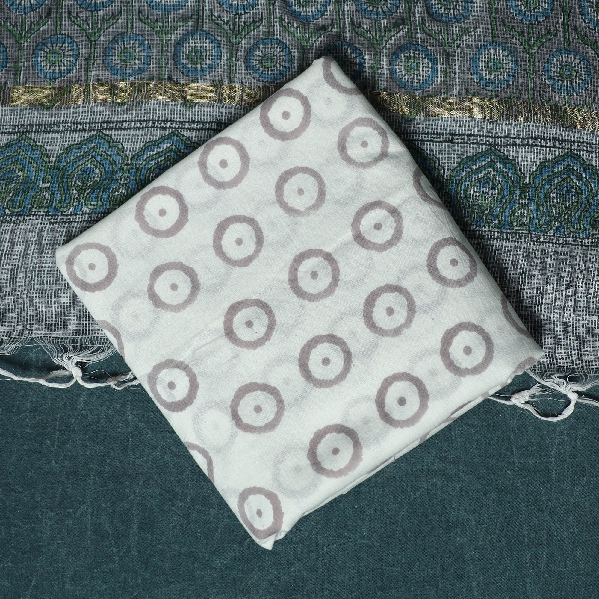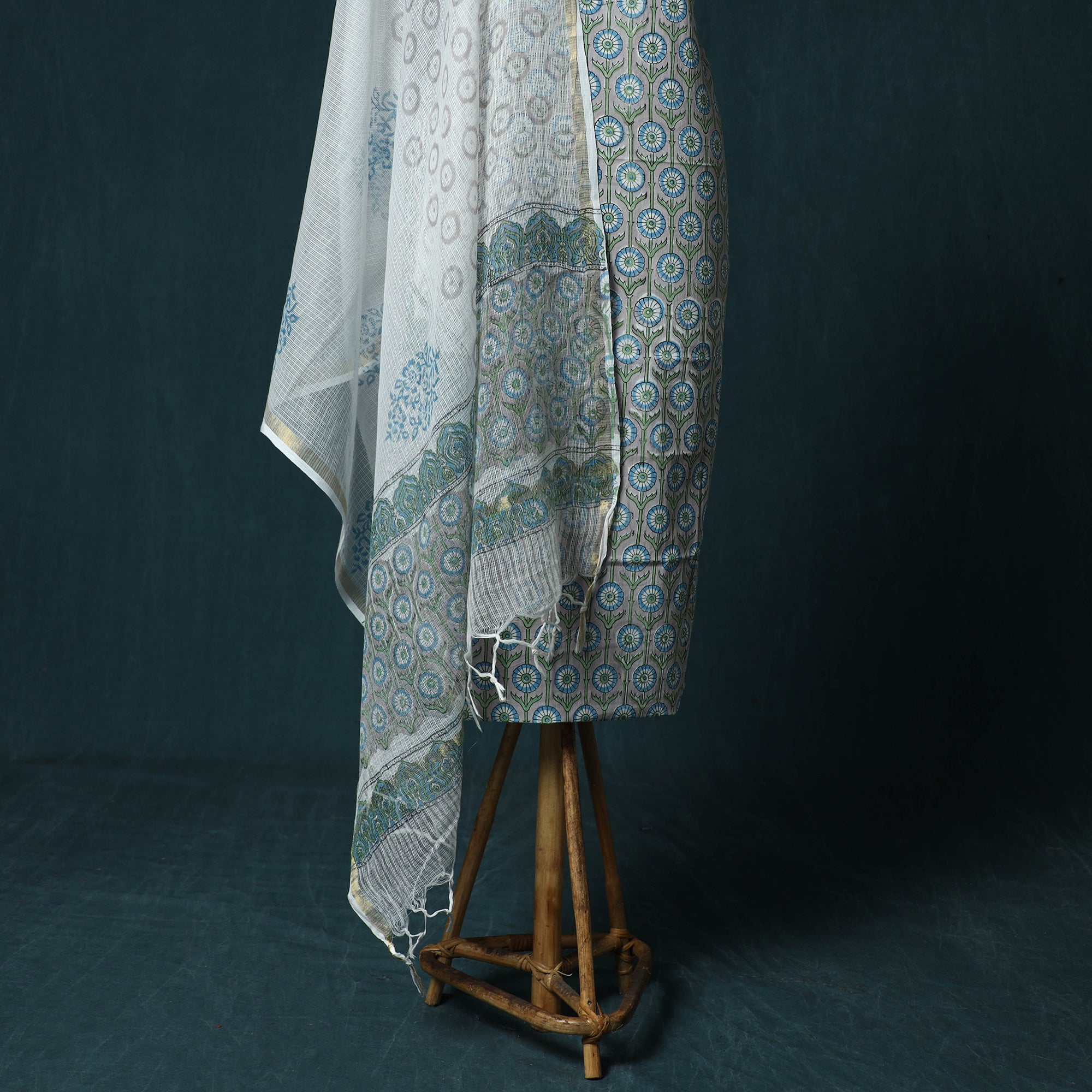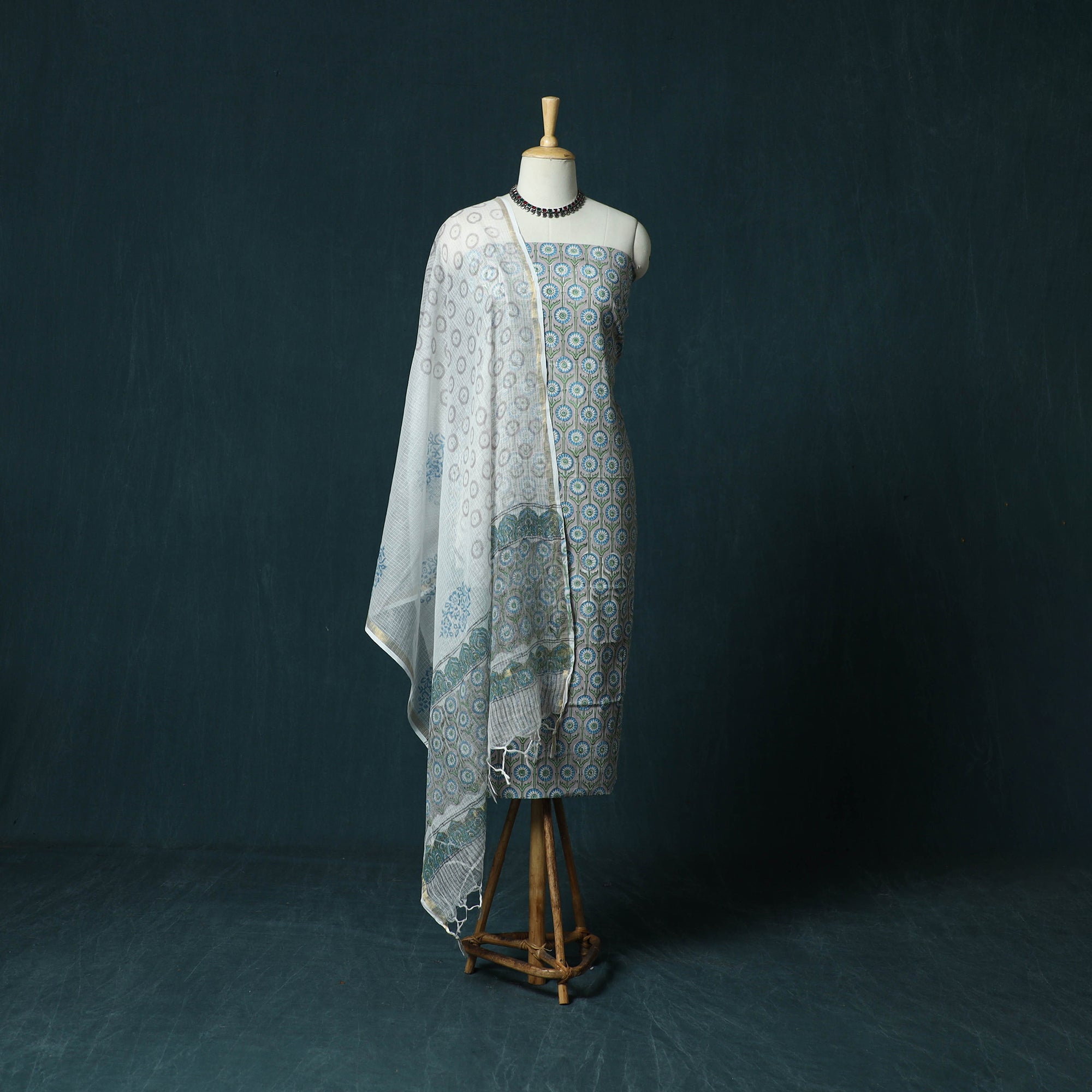 Hand block print sanganeri cotton 3pc unstitched dress material blends traditional artistry with everyday comfort. It is created using the traditional hand block printing technique of Sanganer, a historic town in the southern part of Jaipur, Rajasthan. Practised for over 500 years, this craft is carried forward by skilled artisans, with techniques passed down through generations. Fine patterns are produced using intricately hand-carved wooden blocks. The kurta and bottom fabrics are made from cotton. The dupatta is crafted in kota doria cotton. Kota Doria is an age-old Indian textile produced in the Kota district of Rajasthan. The doria, or threads, are finely interwoven to create signature check patterns. Its lightweight and sheer texture give it an exquisite grace and elegance of its own. This set suitable for daily wear, workdays, and gatherings.