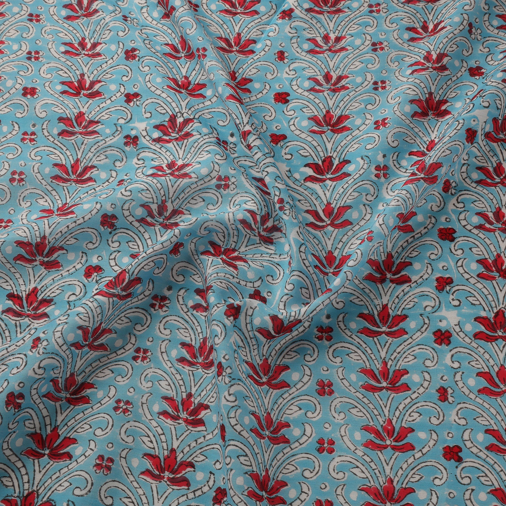 Hand block printed fabric from Rajasthan features delicate sanganeri motifs. Practised for over 500 years, Sanganeri block printing is known for its fine detailing and graceful patterns. Crafted in a bemberg modal blend, the fabric has a smooth surface, fluid drape and lightweight feel. It is dyed using bleed-free VAT colours, ensuring better colour stability. Suitable for apparel and home decor, this fabric adds a subtle touch of cultural charm to everyday designs.