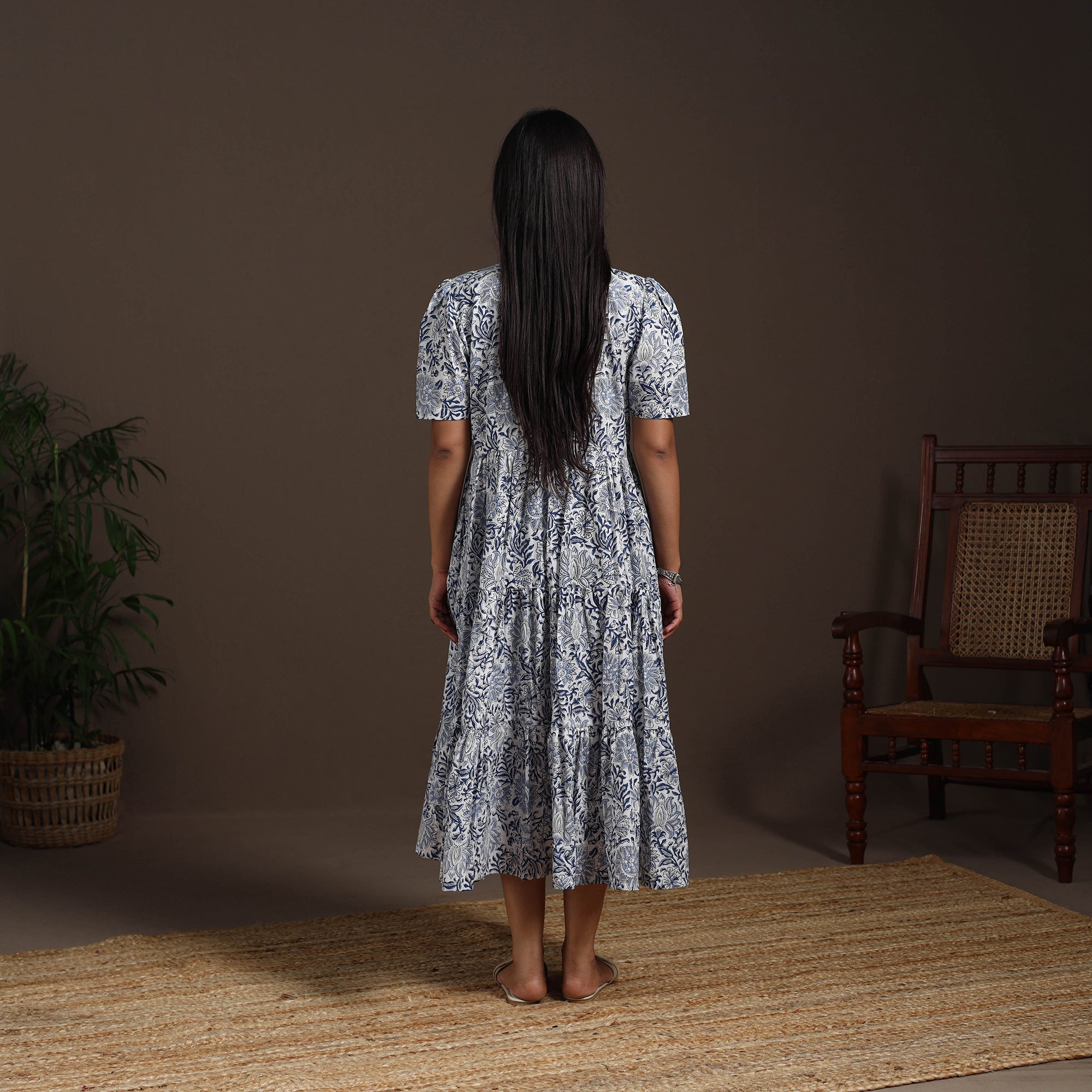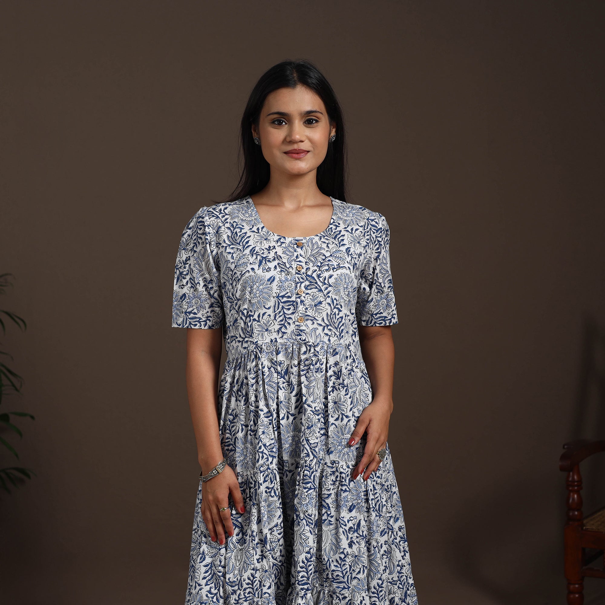 This white hand block print tiered sanganeri dress beautifully blends tradition with comfort. Showcasing delicate block prints from Rajasthan, it features vibrant motifs that add charm to everyday wear. The tiered silhouette feels light, airy, and effortless, making it ideal for casual outings, office wear, or relaxed gatherings.